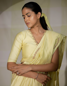Description: Perfect for your summer weddings, featured here is our finest lime yellow sari in silk with embroidered hem all over.The saree is paired with a sleeveless lime yellow blouse.