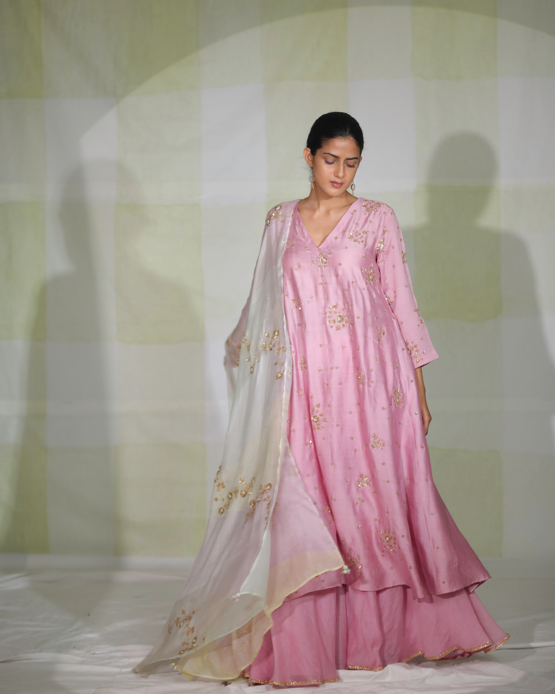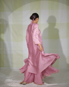 The kurta is paired with a flared onion pink chanderi trousers with colour blocked dupatta featuring embroidered details.