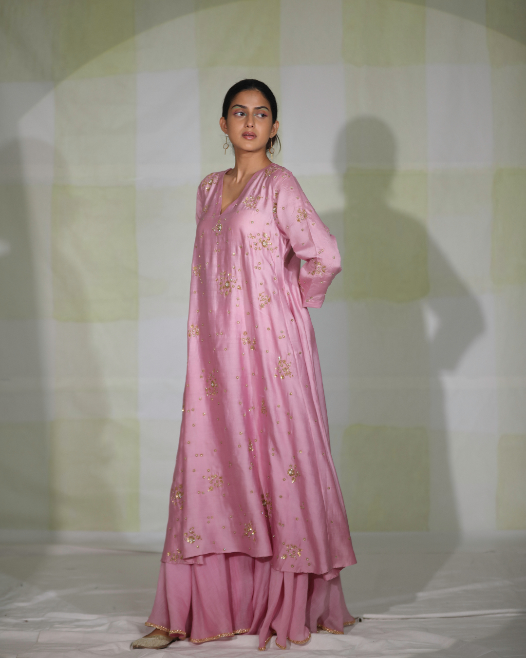 Featured here is our onion pink A line kurta in silk with floral embroideries all over.