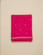 Description: Featuring here is our fuchsia silk moti and zari hand embroidered saree paired with all over moti hand embroidered 'V' neck blouse