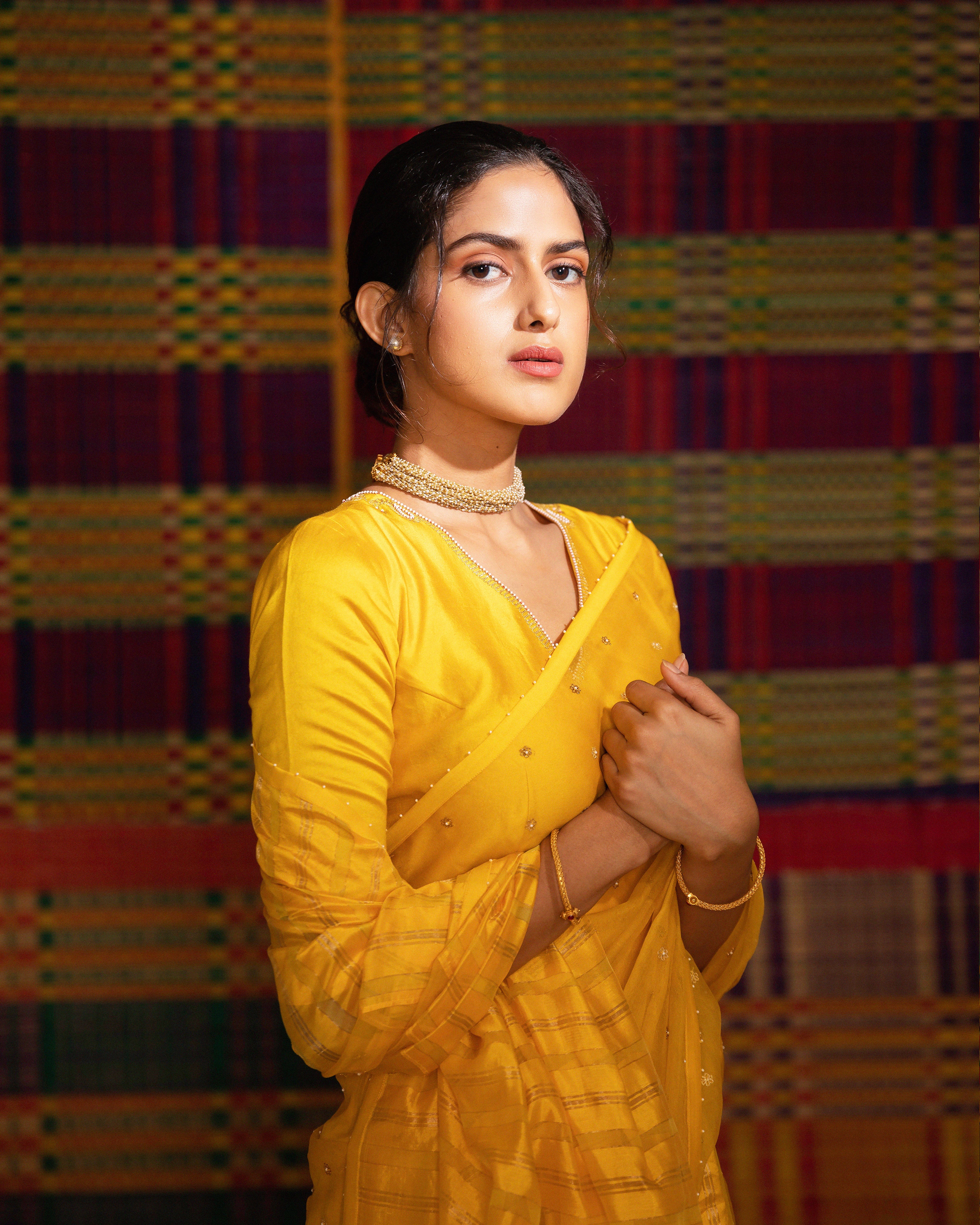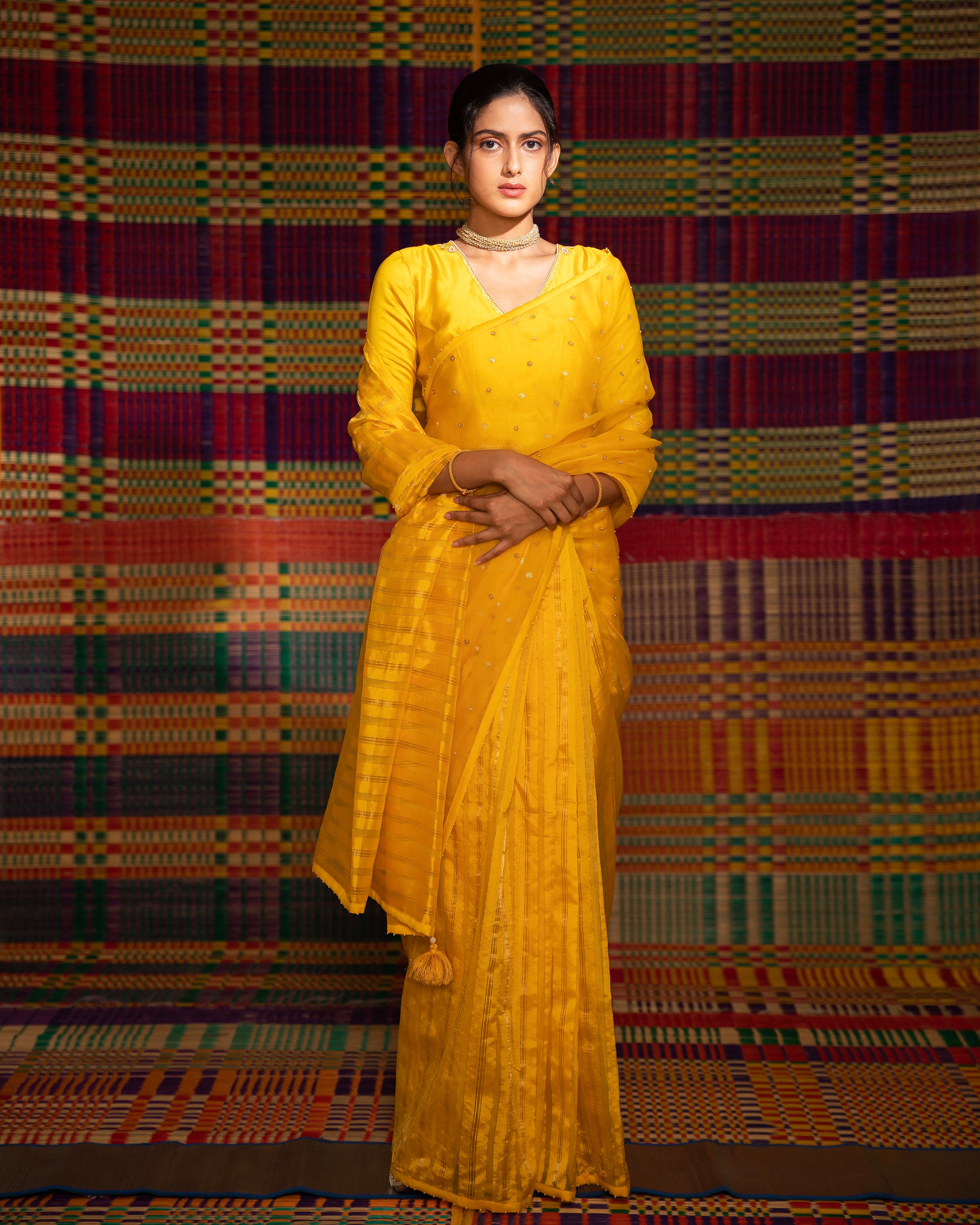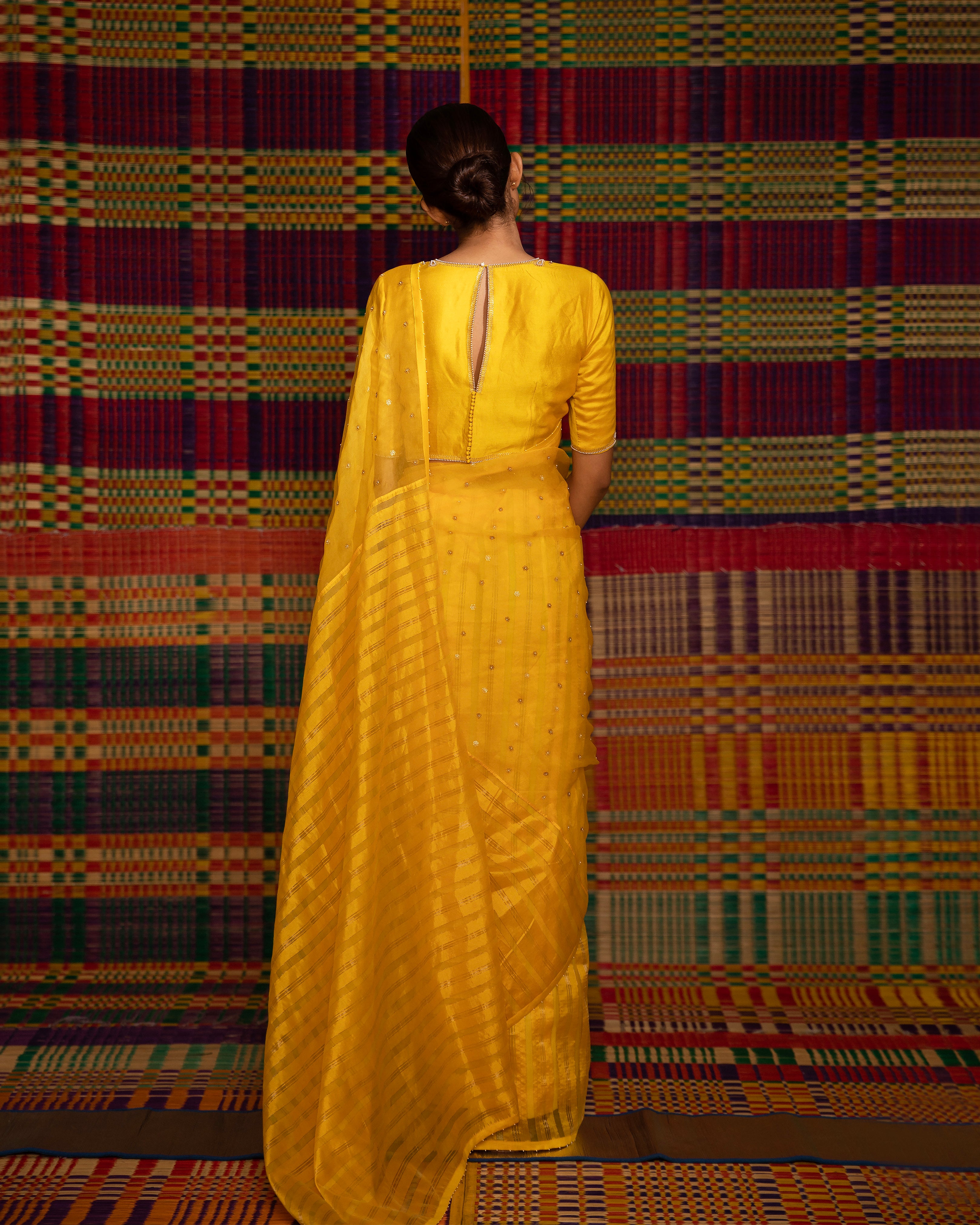 Featured here is our yellow striped half and half sari with moti and aari work bootis all over. Accompained with a 'V' neck yellow blouse featuring a delicate pearl neckline.