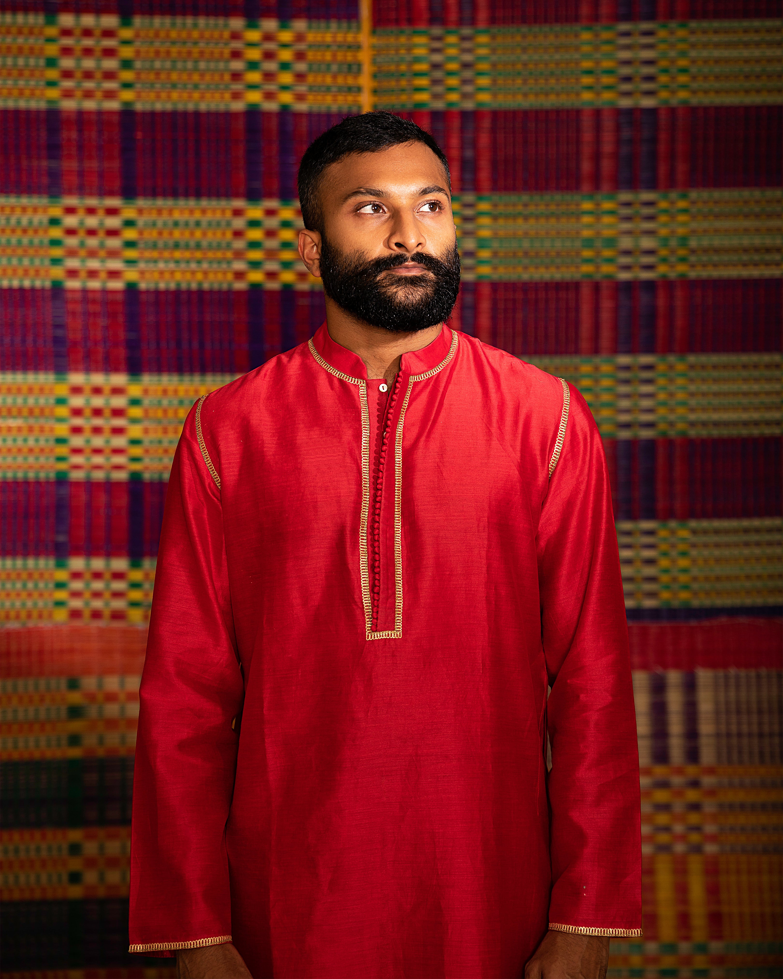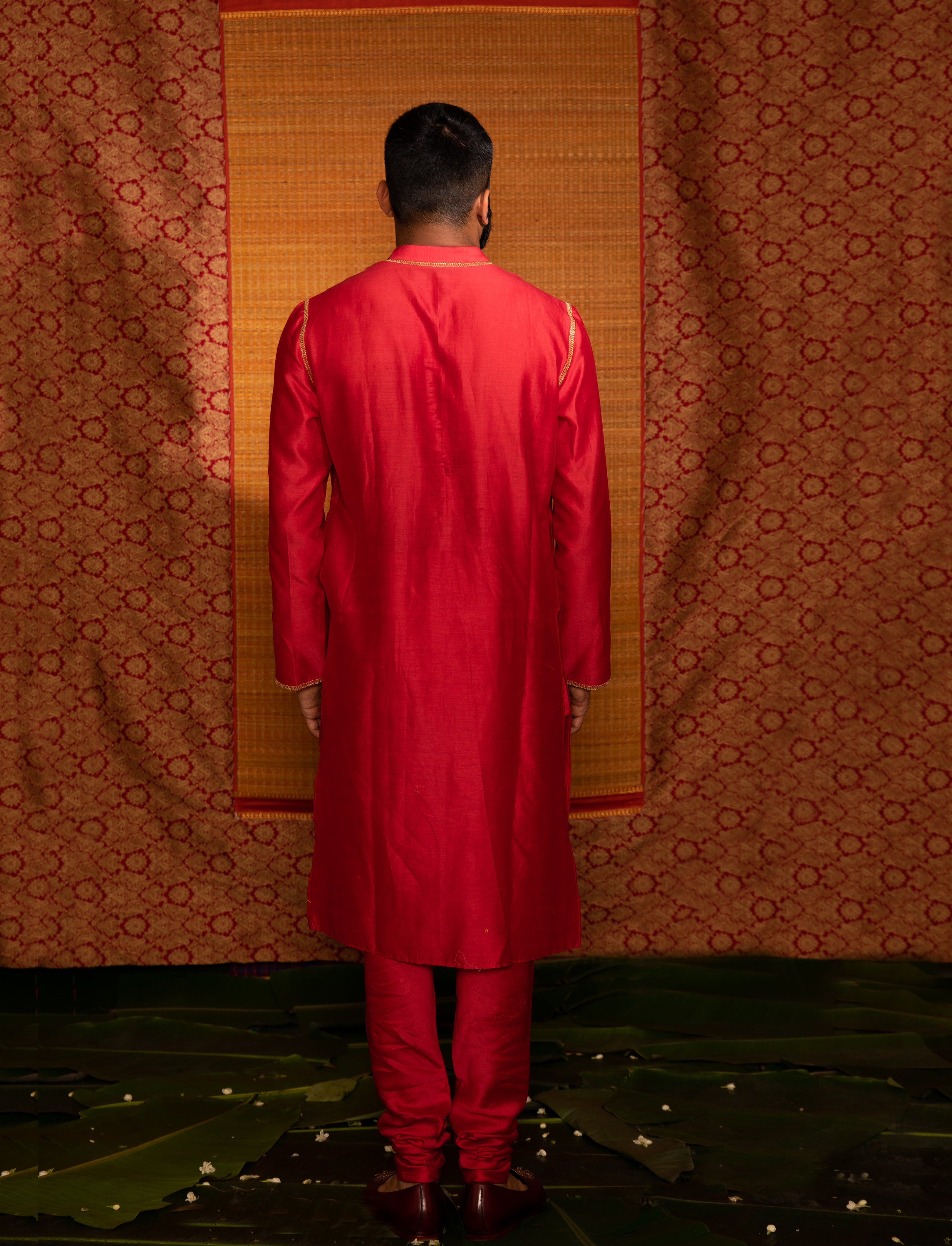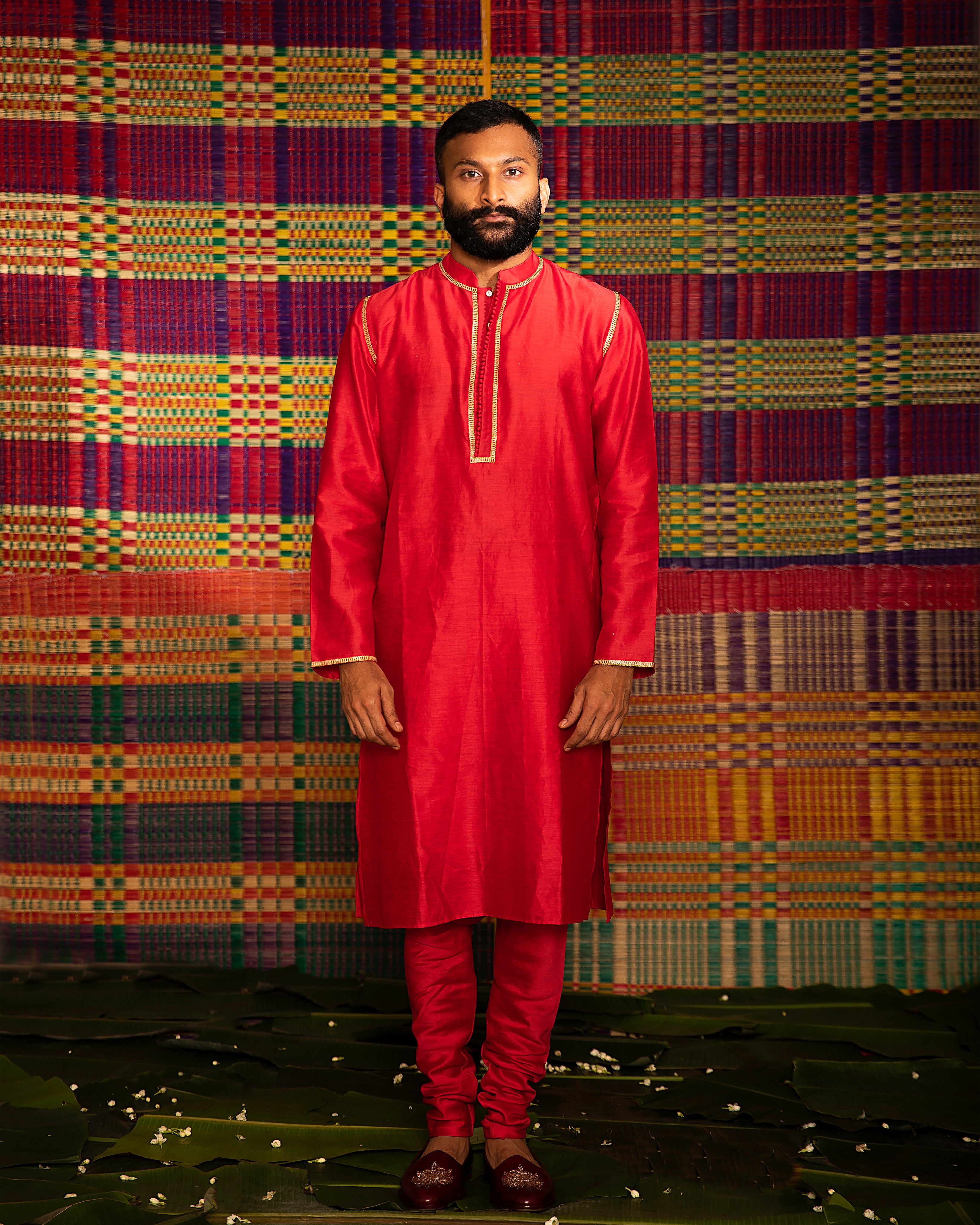 Featured here is our red hand embroidered chanderi men's kurta coordinated with red chudi pants.