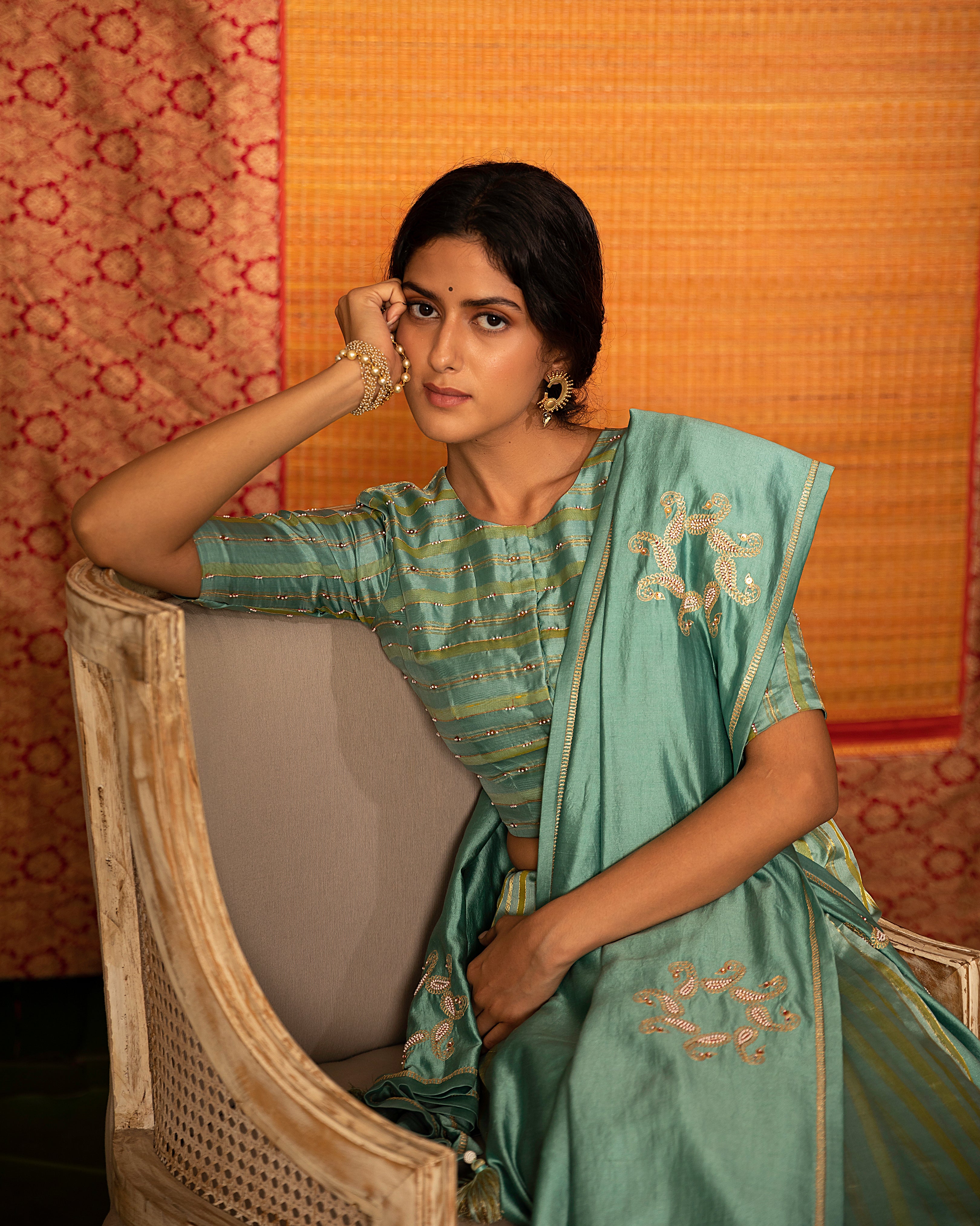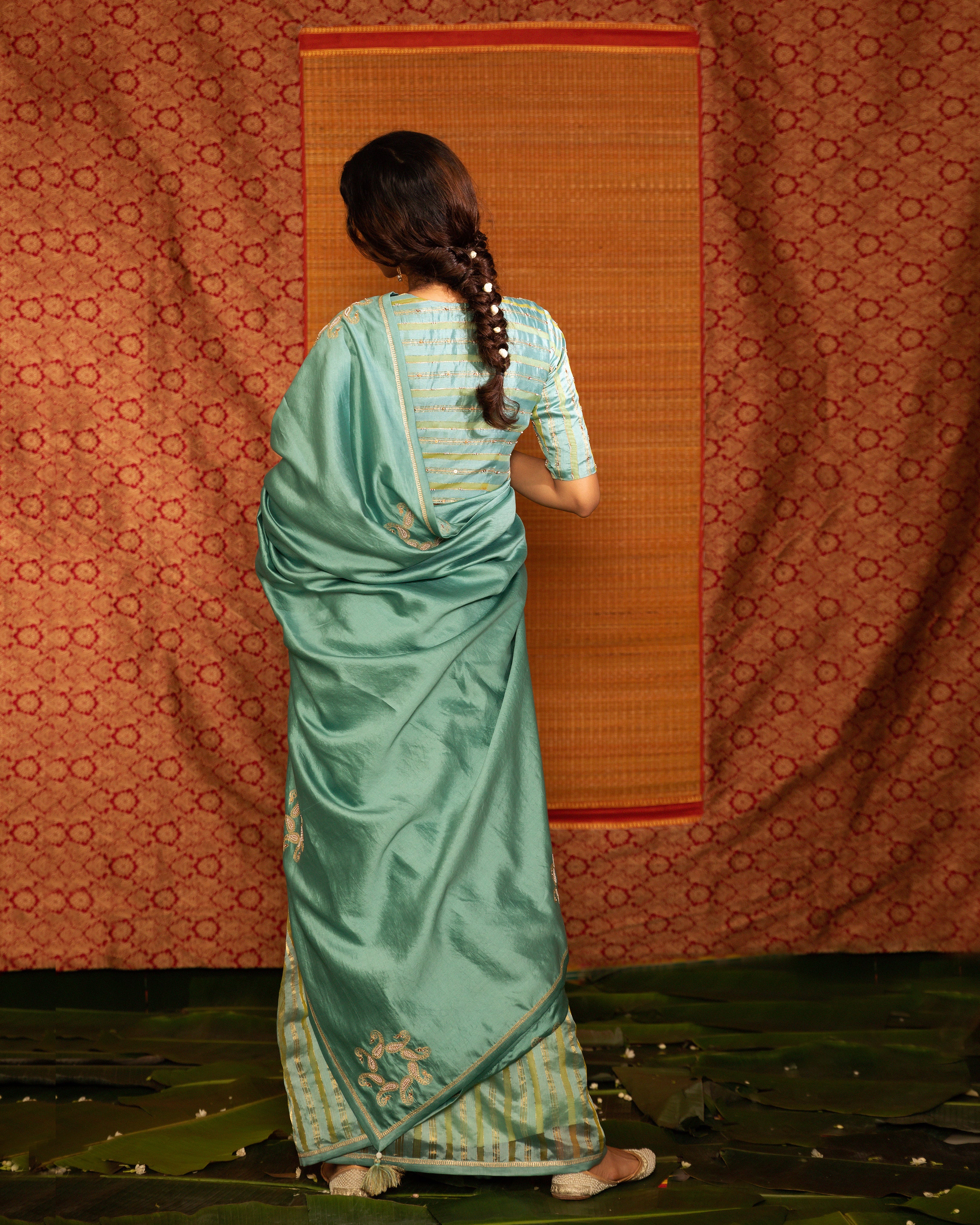 Teal Half and Half Hand Embroidered Sari with Blouse
