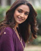 Description: Featured here is our most favourite angrakha set in lush purple colour detailed with fine hand embroidery. The kurta is paired with straight fit aubergine pants and chanderi dupatta.