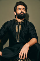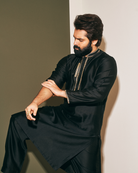 Description: Featured here is our Black men's kurta in silk with zari and moti embroidery. The kurta is paired with black straight fit trousers and embroidered dupatta.