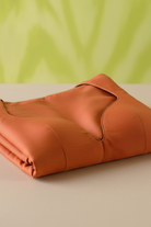 Description: Rust orange half and half saree is made by joining silk and organza for a smooth drape. It features printed pink applique flowers with Zari aari hand embroidary with detailed hand finished border.