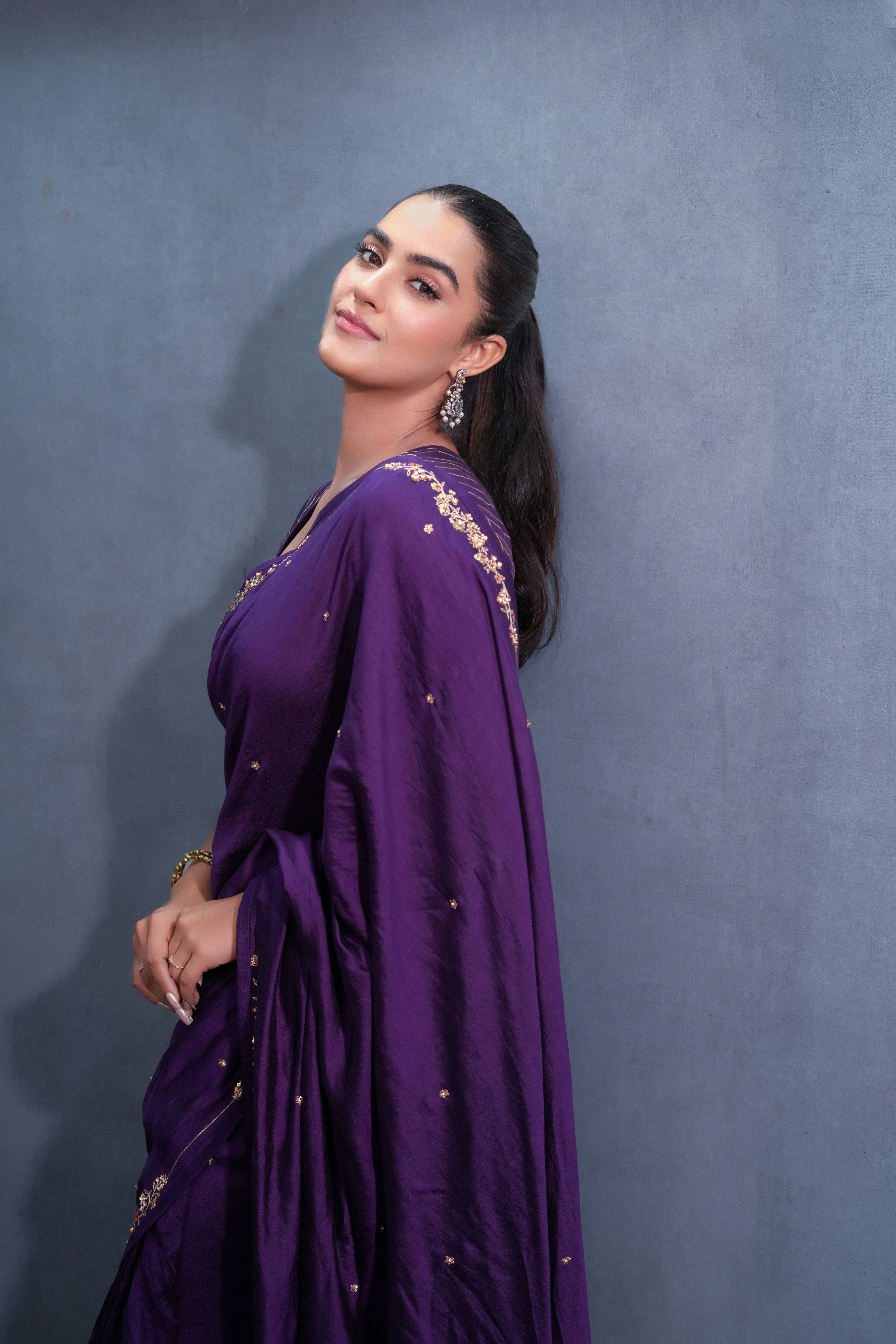 Description: Featured here is our Aubergine sari with hand embroidered aari details on the sari and palla. The sari is paired with a V neck blouse in silk.