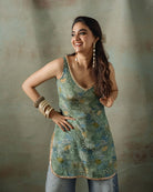 Description: A charming green apple floral-printed sleeveless short kurta crafted in luxurious crepe silk, embellished with intricate sequence and bead embroidery all over for a touch of sparkle.