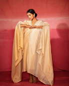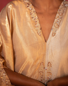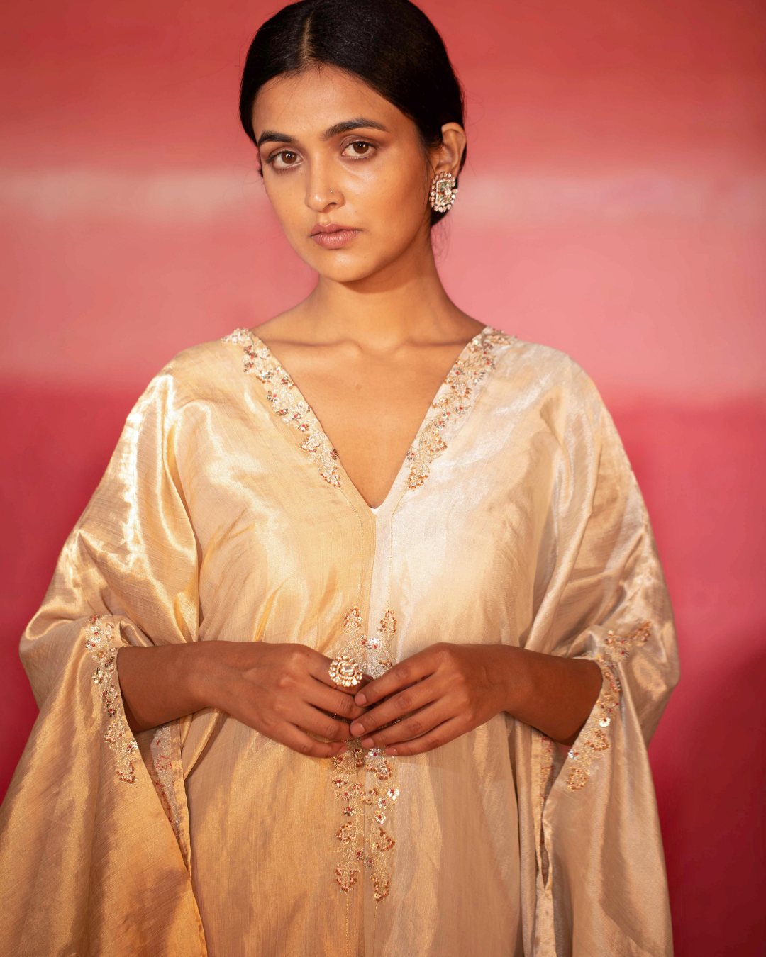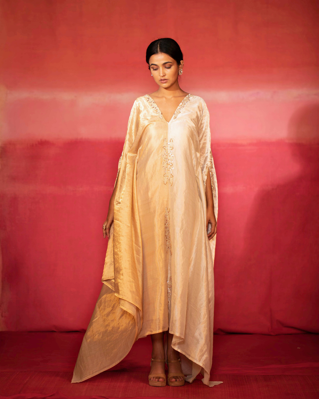 Featured here is our dual toned kaftan in silver and gold tone. The kaftan is delicately hand embroidered in fine aari and moti work.