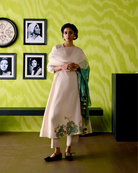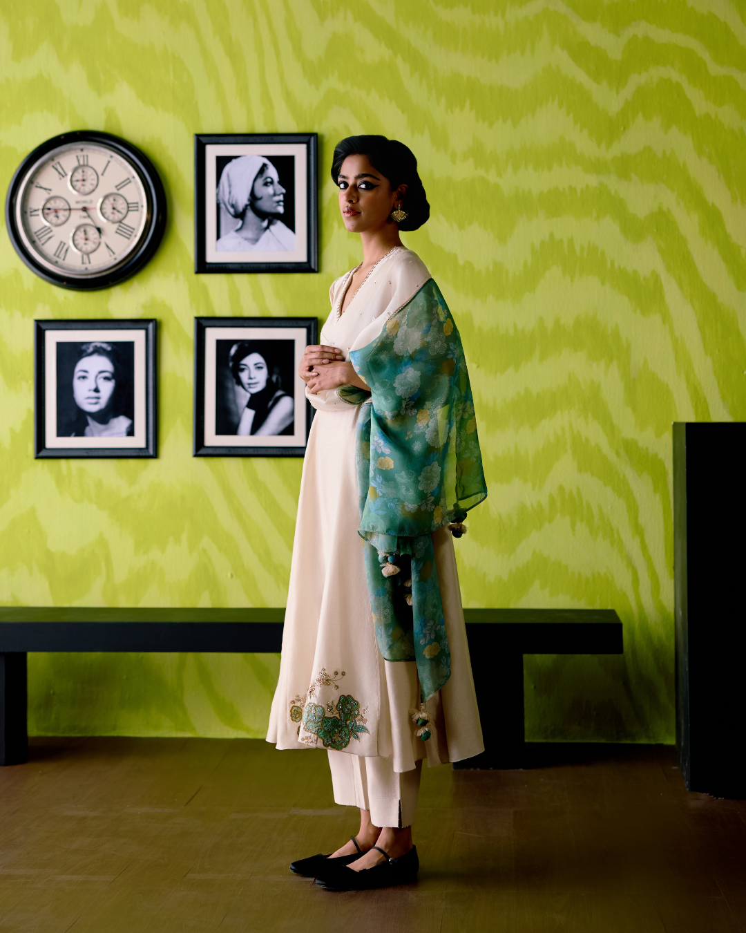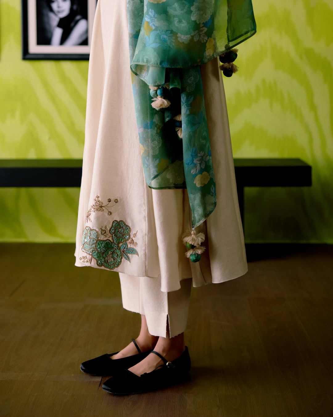 Description: Ivory panelled A-line kurta crafted from luxurious chanderi fabric, adorned with delicate floral bunches appliquéd in shimmering zari and intricate cutdana work on the yoke and hem, bringing a touch of regal opulence.