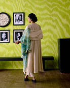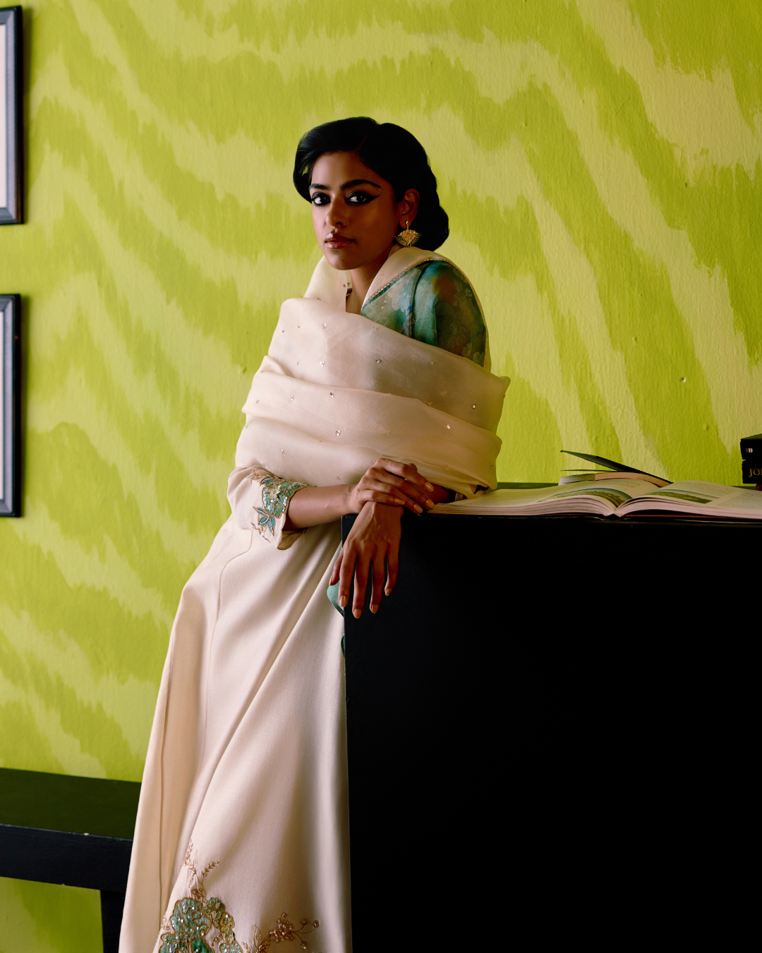 This masterpiece is paired with perfectly tailored straight pants for a modern, sophisticated silhouette. The ensemble is completed with a graceful organza dupatta, featuring a soft sage green floral print along the edges, adding a fresh, delicate contrast to the rich tones of the kurta.