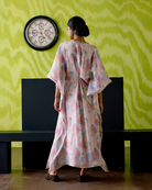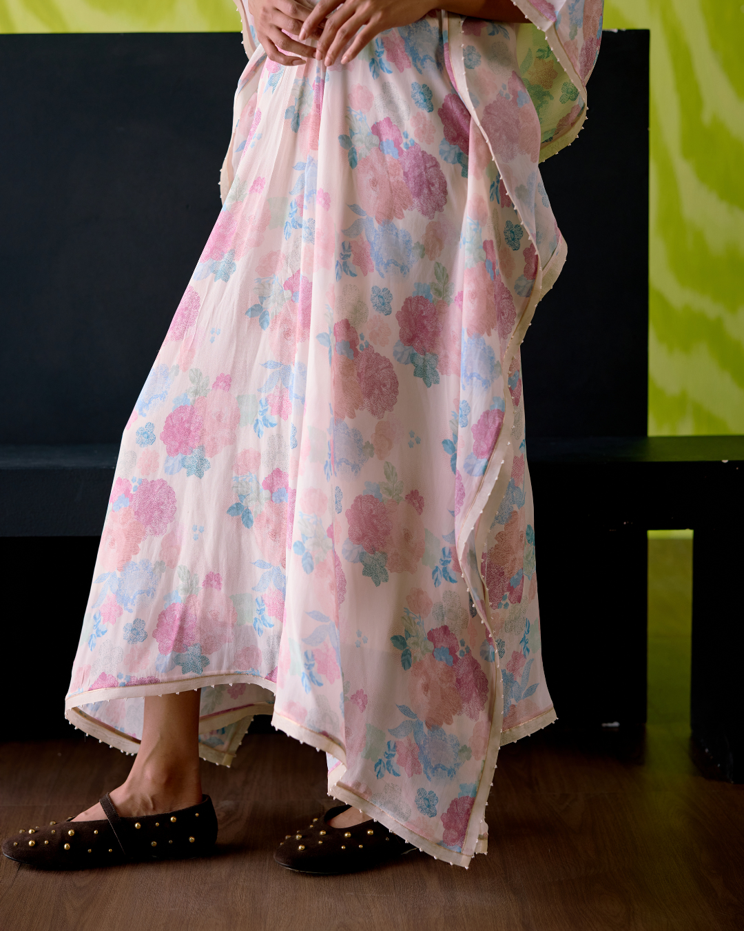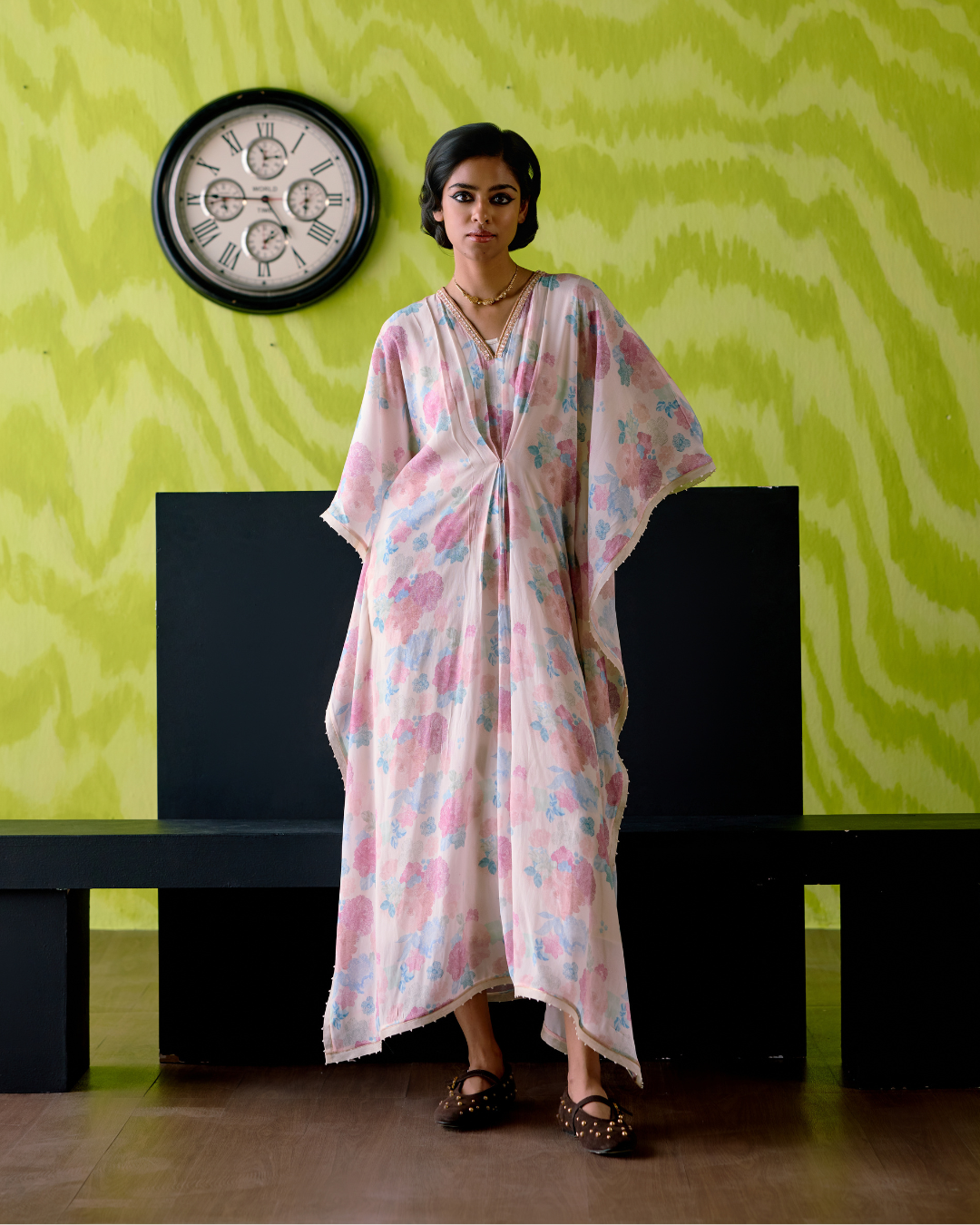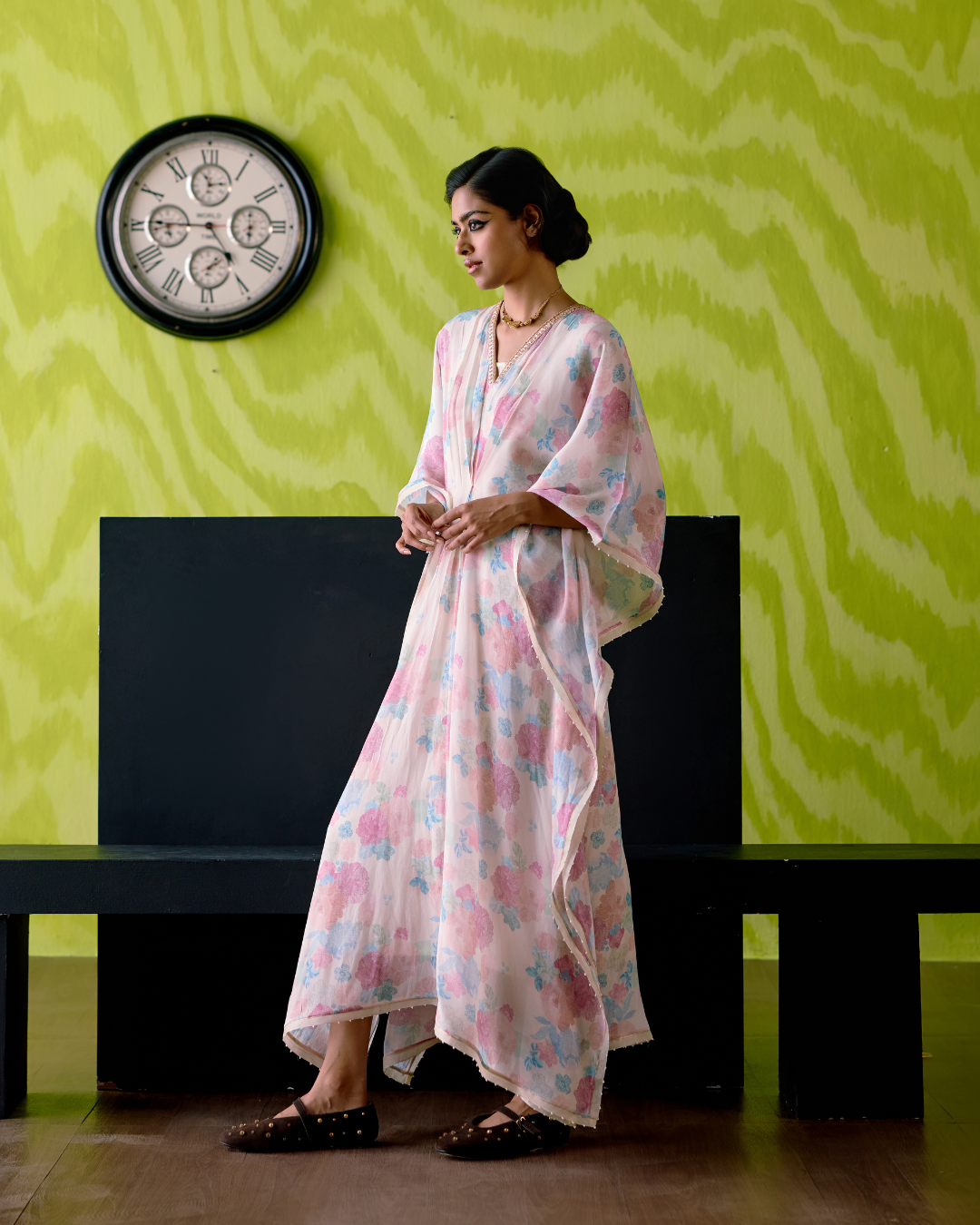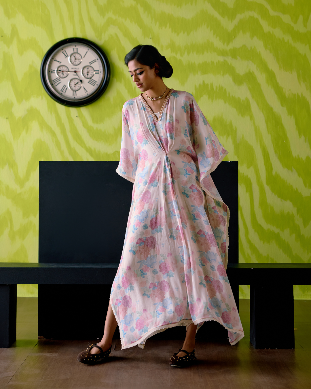 Description: An ivory multi-color floral print kaftan, crafted in luxurious crepe silk. The neckline is adorned with intricate cutdana flower border embroidery, adding a touch of glamour and finesse to the flowy, relaxed silhouette.