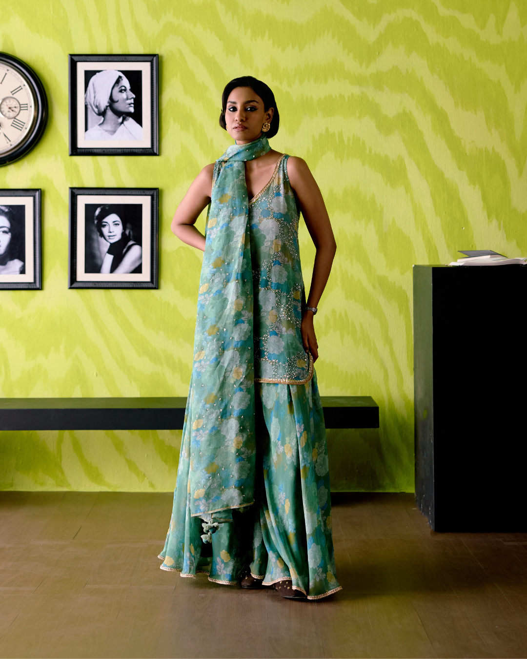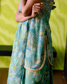 Description: A charming green apple floral-printed sleeveless short kurta crafted in luxurious crepe silk, embellished with intricate sequence and bead embroidery all over for a touch of sparkle.