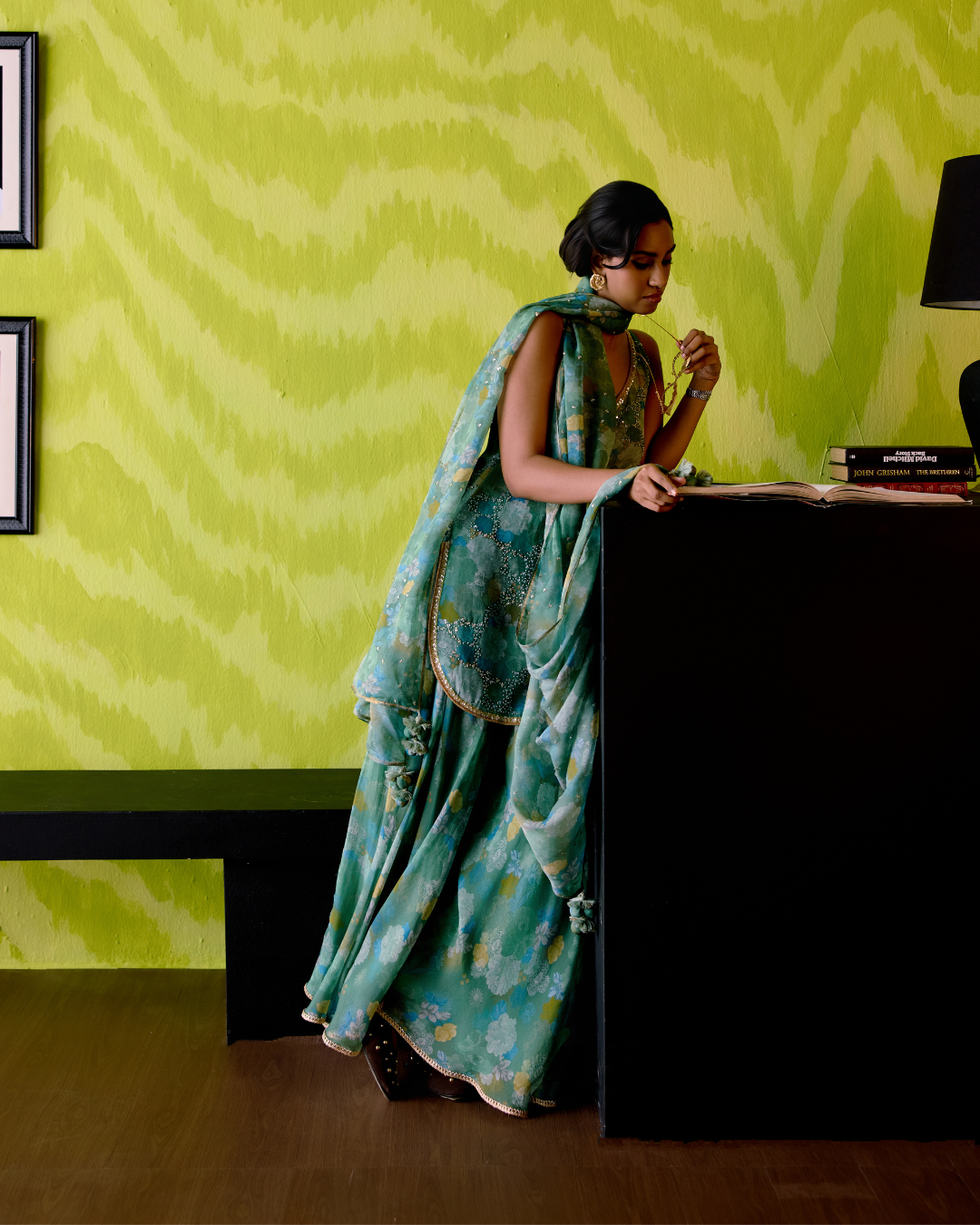 It’s paired with a graceful floral print organza dupatta, adorned with exquisite sequence detailing, and a stylish sharara featuring a delicate lace trim on the hem.