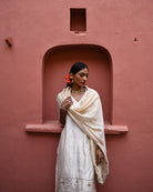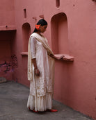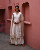 Description: Featured here is our Ivory hand embroidered kurta with embroidered box motifs on the hem of kurta. The kurta is paired with ivory flared sharara trousers and dupatta.