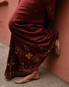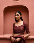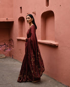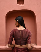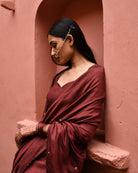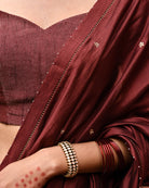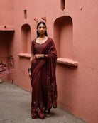 Description: Featured here is our mahogany hand embroidered saree with heavy pallu. The saree is paired with a mahogany blouse.