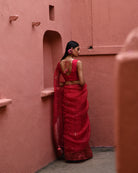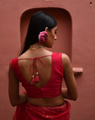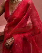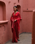 Description: Featured here is our vermillion saree in organza and attached striped tissue at the bottom with hand embroidered buttas all over. The saree is paired with a V neck vermillion blouse.