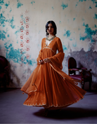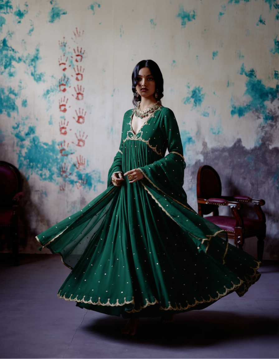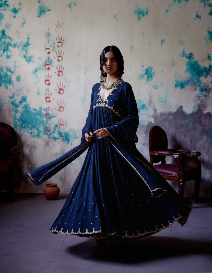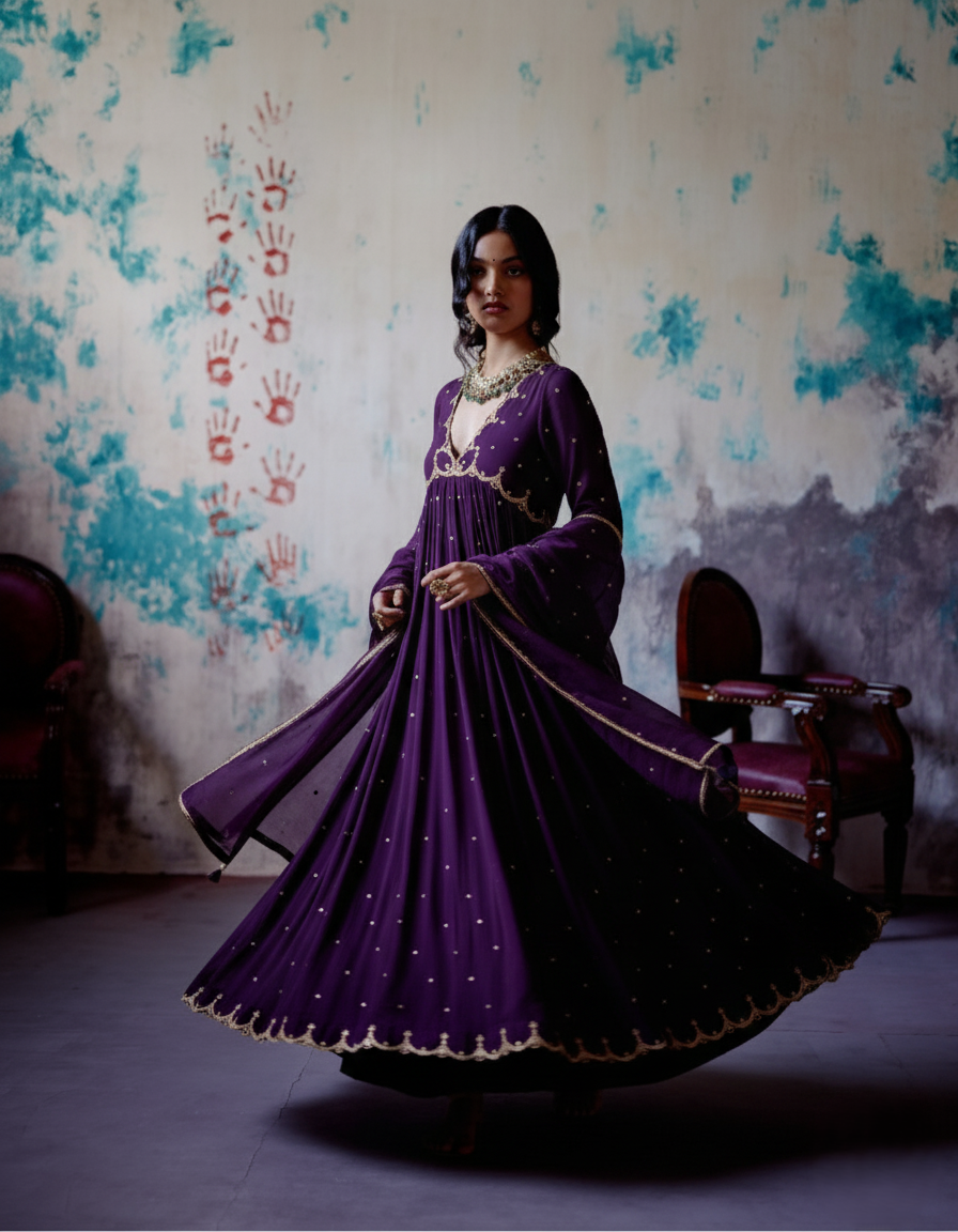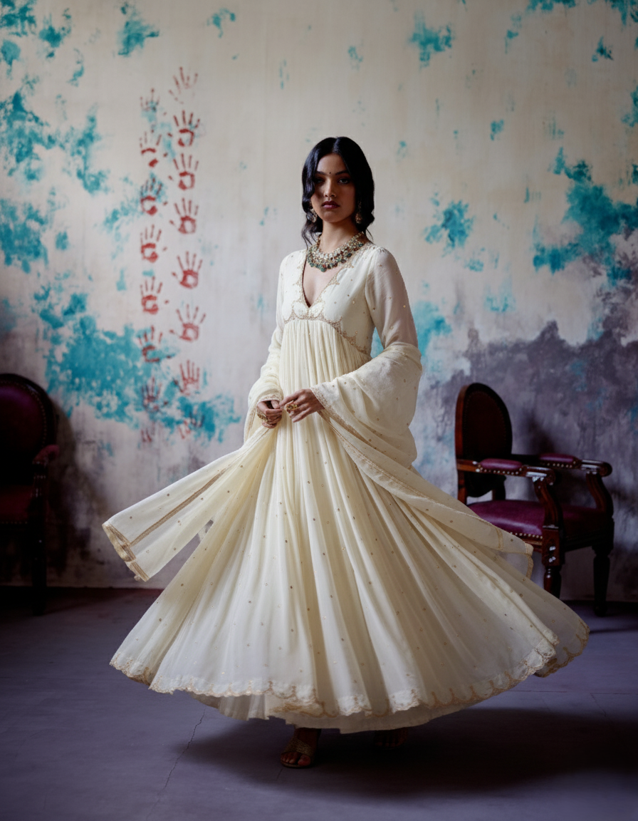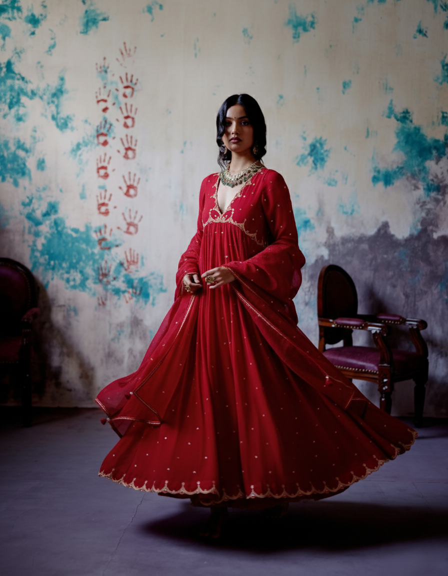 Description: Crafted in chiffon, this fuchsia anarkali showcases a V-neckline embellished with intricate aari and moti hand embroidery along the yoke and hem. The ensemble includes a kurta paired with chuddi pants and a delicately hand-embroidered organza dupatta, reflecting refined craftsmanship.