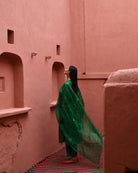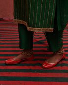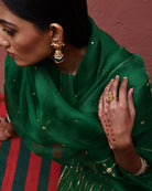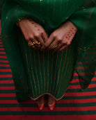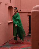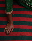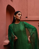 Description: Featured here is our green hand embroidered straight fit kurta with all over stripes, the kurta is paired with a straight fit trouser and organza dupatta.