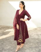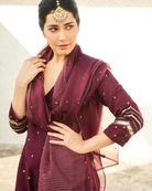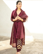 Description: Featured here is our hand embroidered Jamuni Angrakha with gota details paired with straight fit trousers and checkered chanderi dupatta.