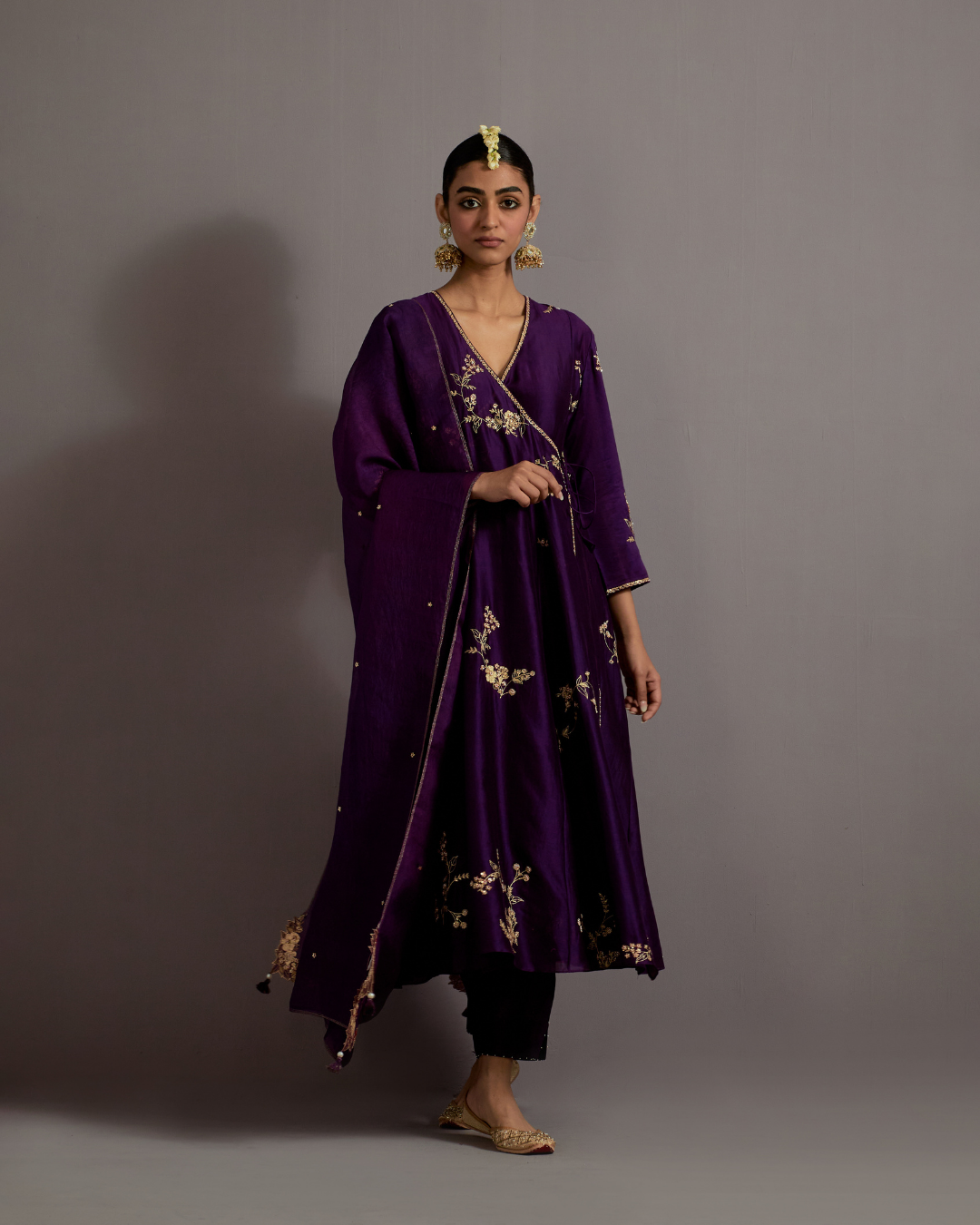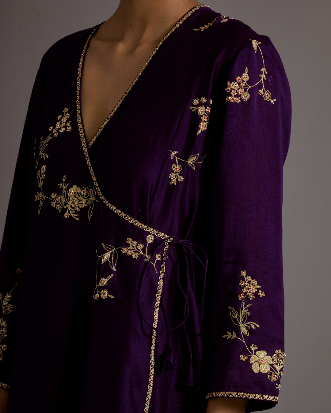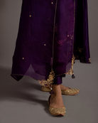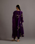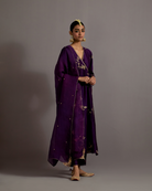 Description: Featured here in our classic angrakha style is a purple kurta with pool guccha embroidery all over with a tie detail on the side. The kurta is paired with a straight fit trouser and an organza dupatta.