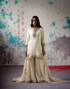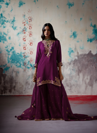 Description: Vermillion Sharara Set combines traditional craftsmanship with elegant design. The short silk kurta is adorned with detailed aari and moti embroidery on the neckline, hem, and sleeves, highlighting fine artisanal work. Complementing the kurta, the flared organza shararas feature all-over sequin embellishments, adding a subtle shimmer.