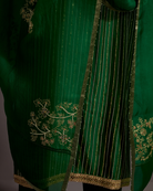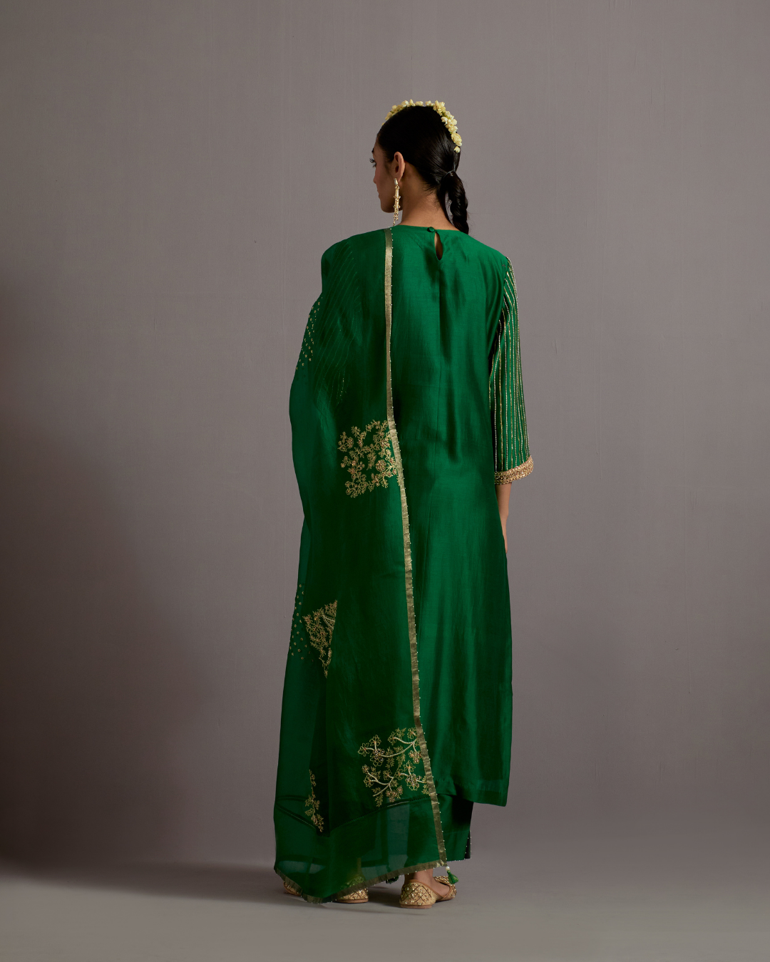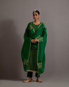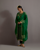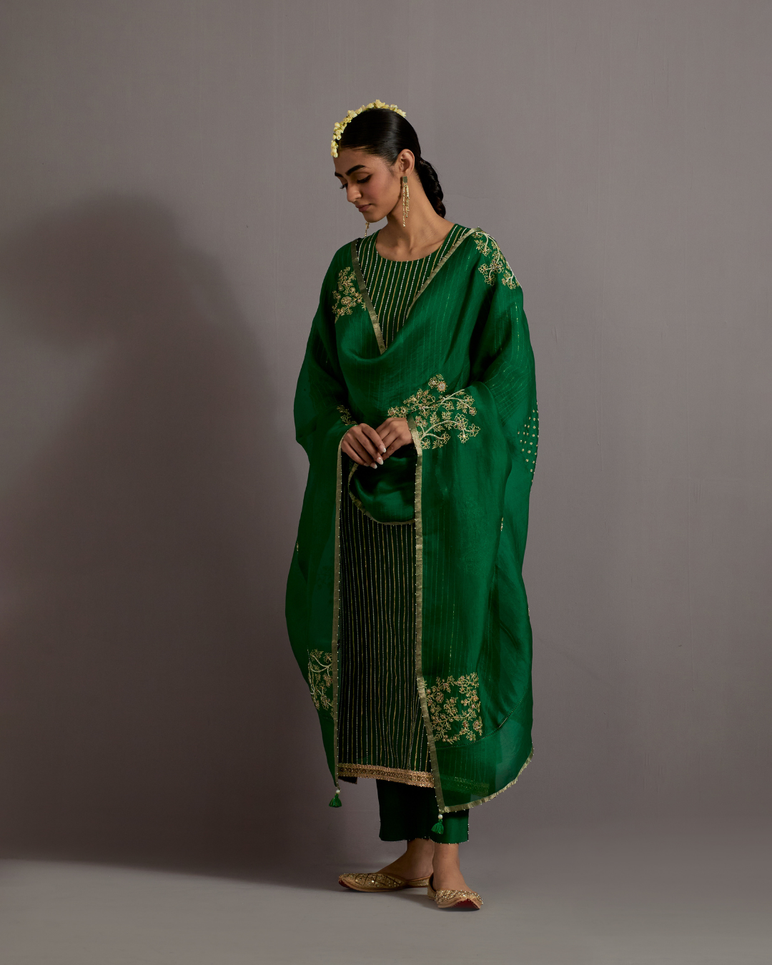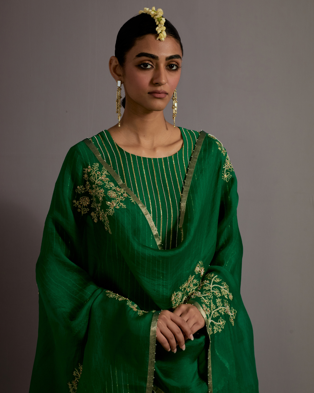 Description: A must have festive look, featuring a green kurta with hand woven lines all over is paired with a flared trousers and an organza dupatta with blocks of embroidery all over.