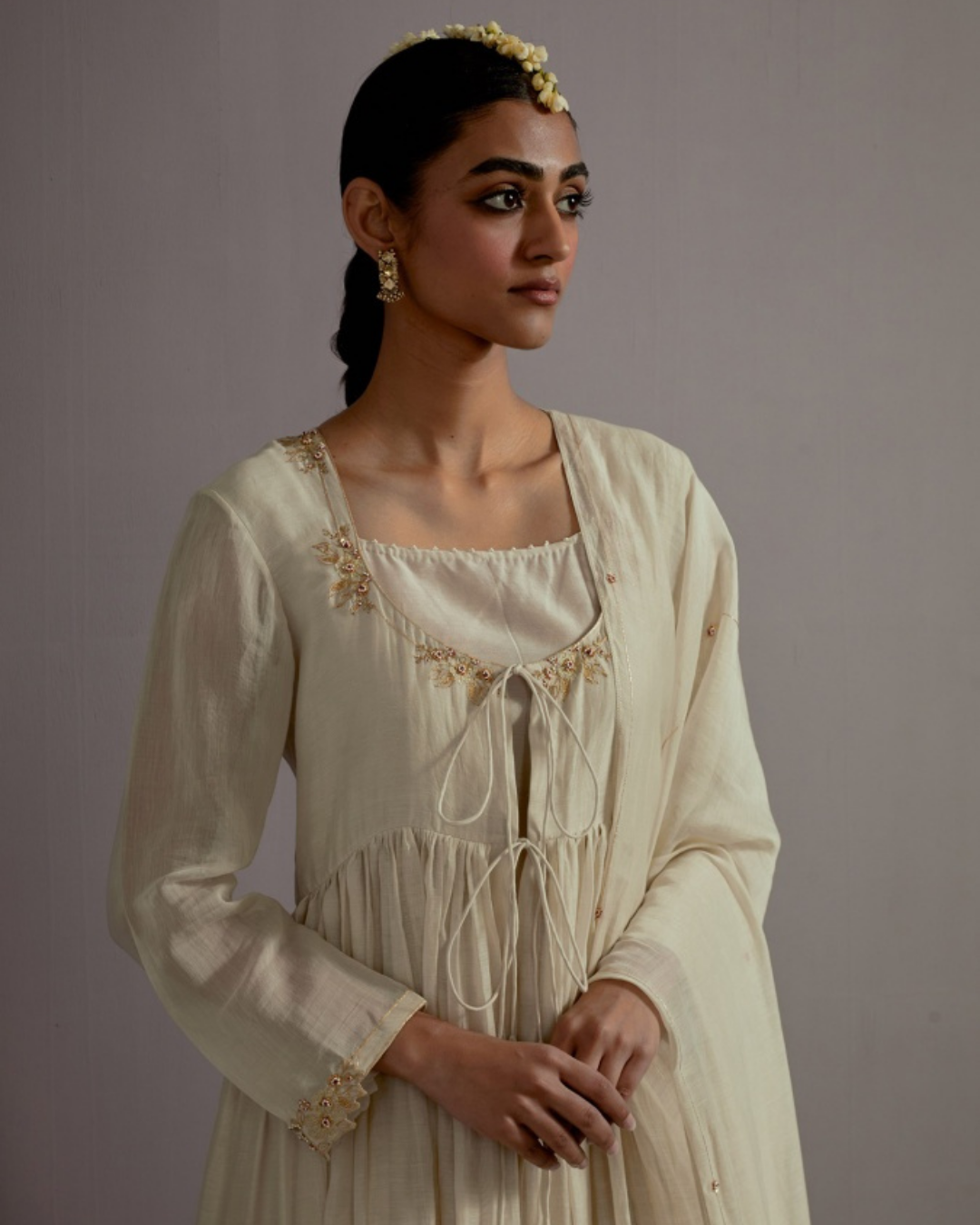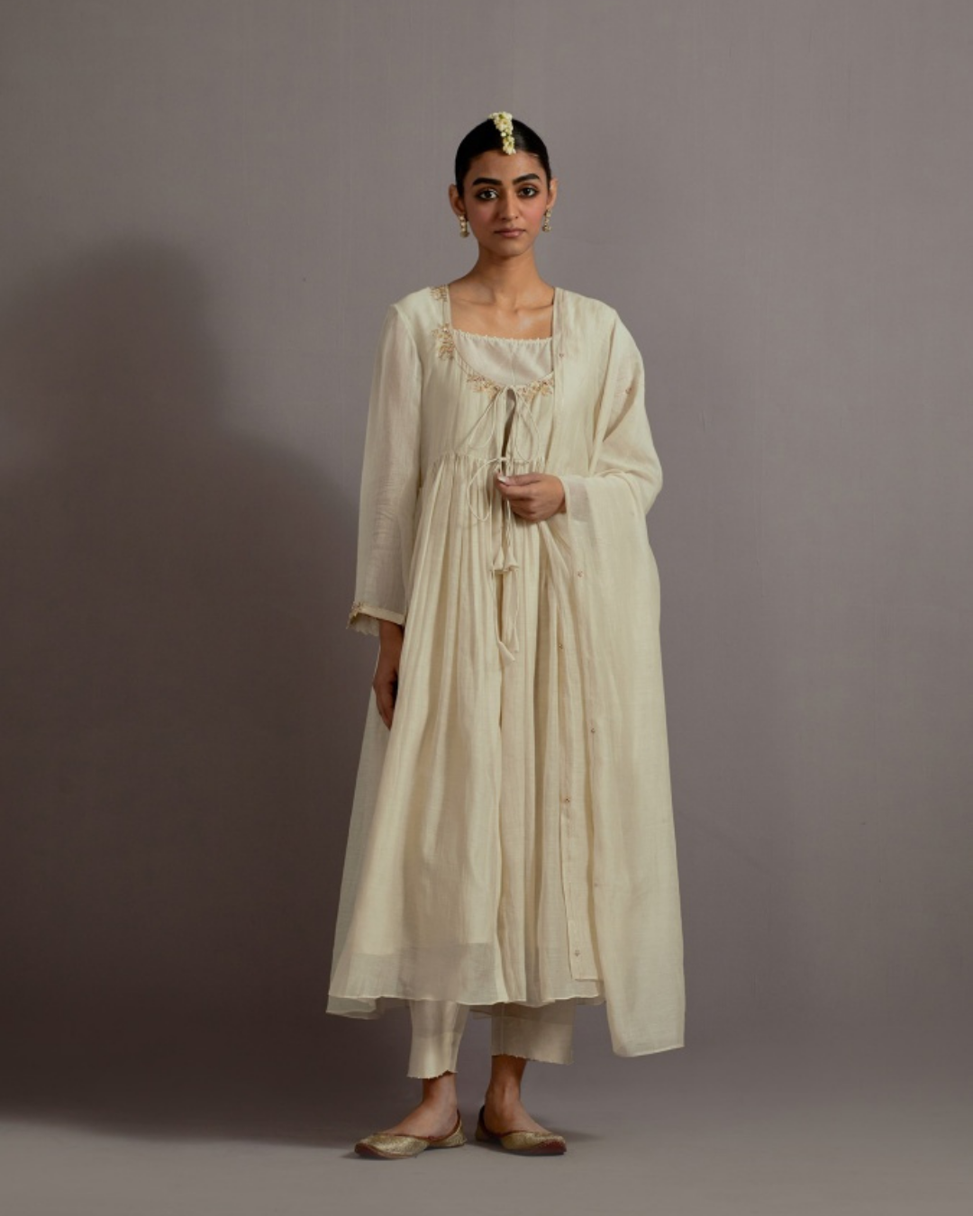 Description: Featured here is our ivory slip paired with an ivory embroidered overlay on top with centre tie details. The kurta is paired with straight fit trousers and chanderi dupatta.