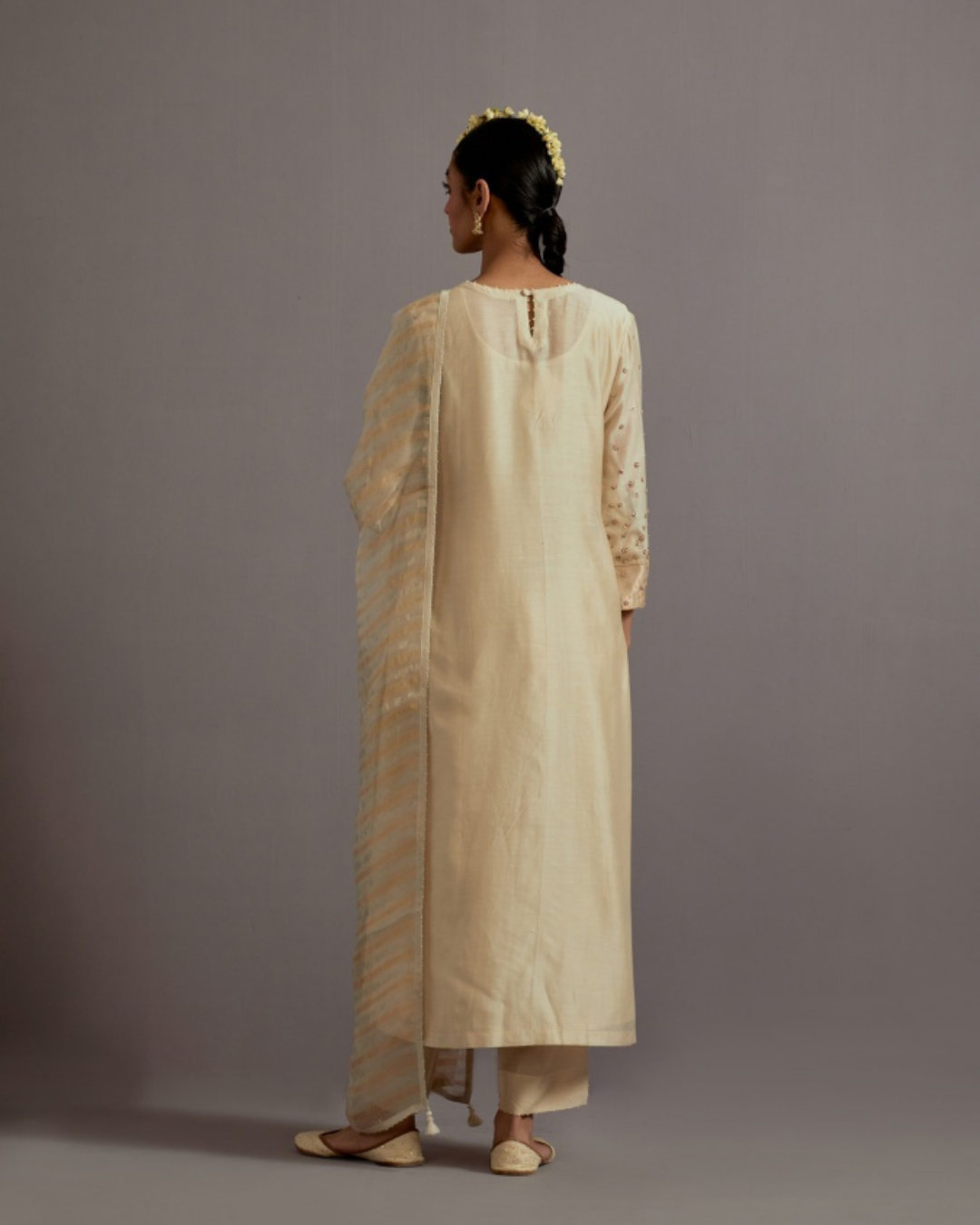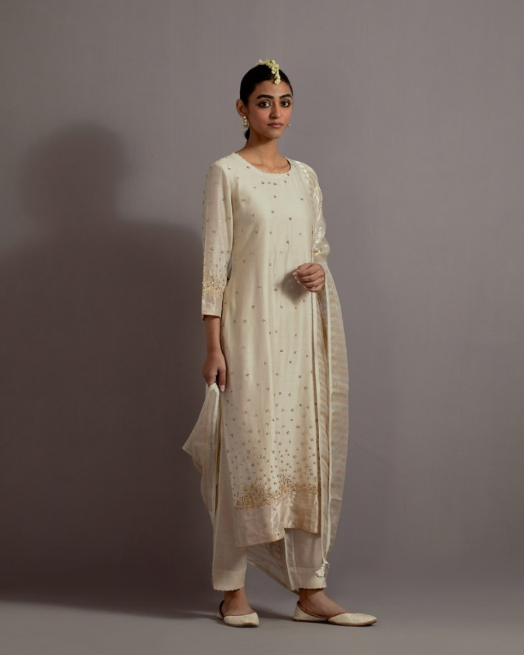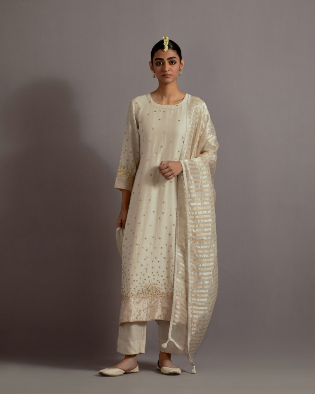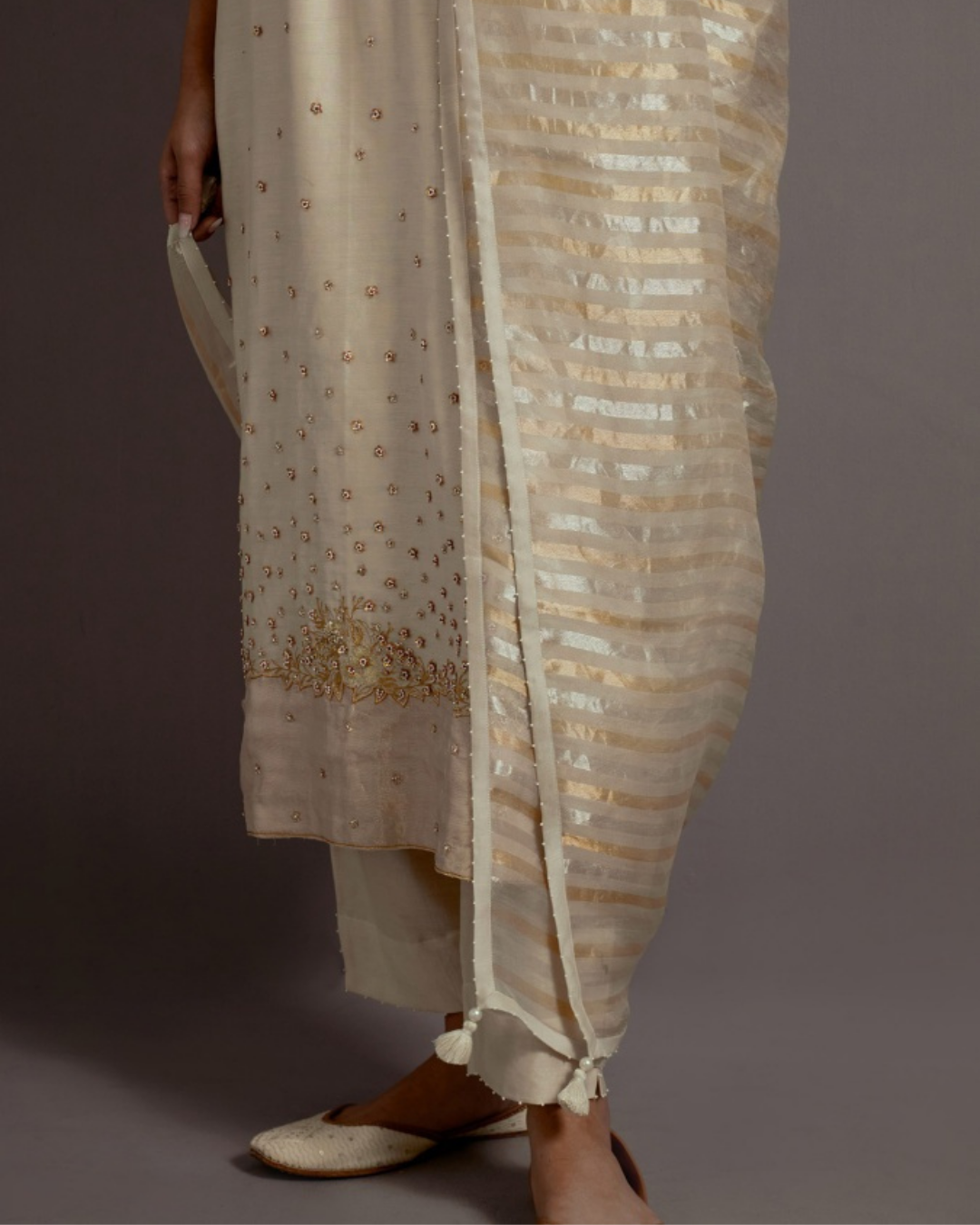 Description: Featured here is our straight fit kurta in ivory with hand embroidered appliqué details on the hemline. The kurta is paired with a straight fit trousers and organza striped dupatta.