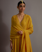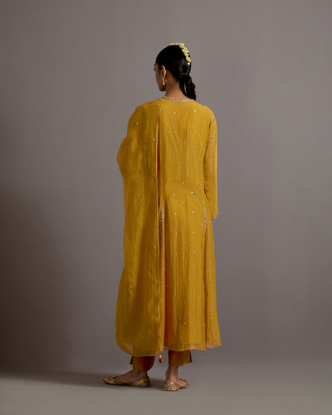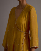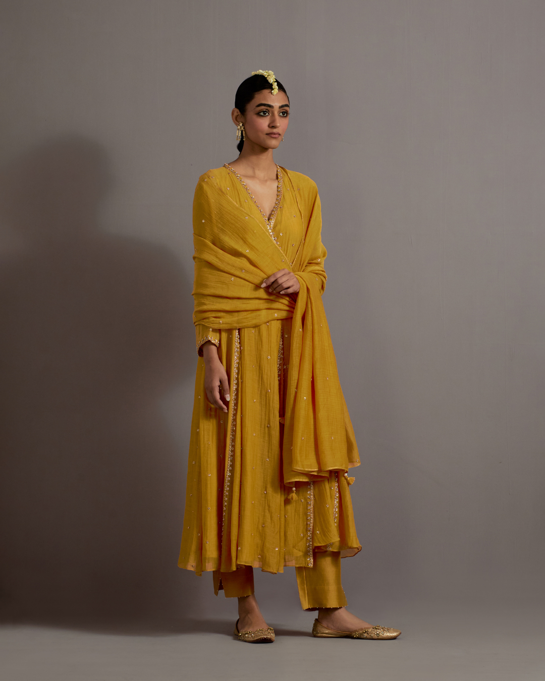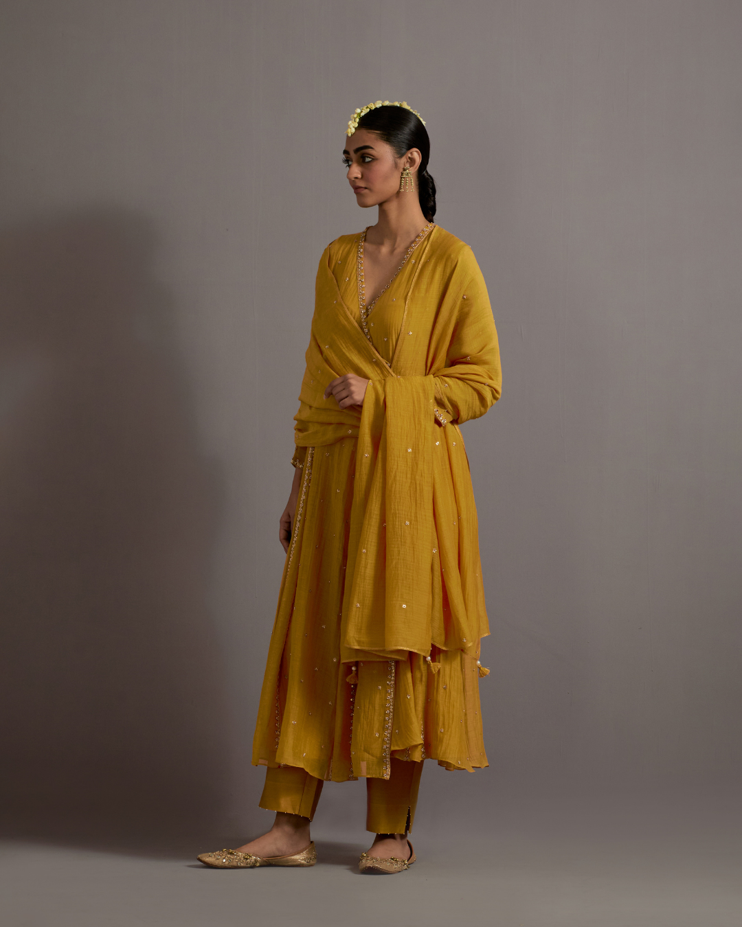 Description: Featured here is our mustard angrakha with embroidery on the kalis. The kurta is paired with a mustard straight fit pants and chanderi dupatta.