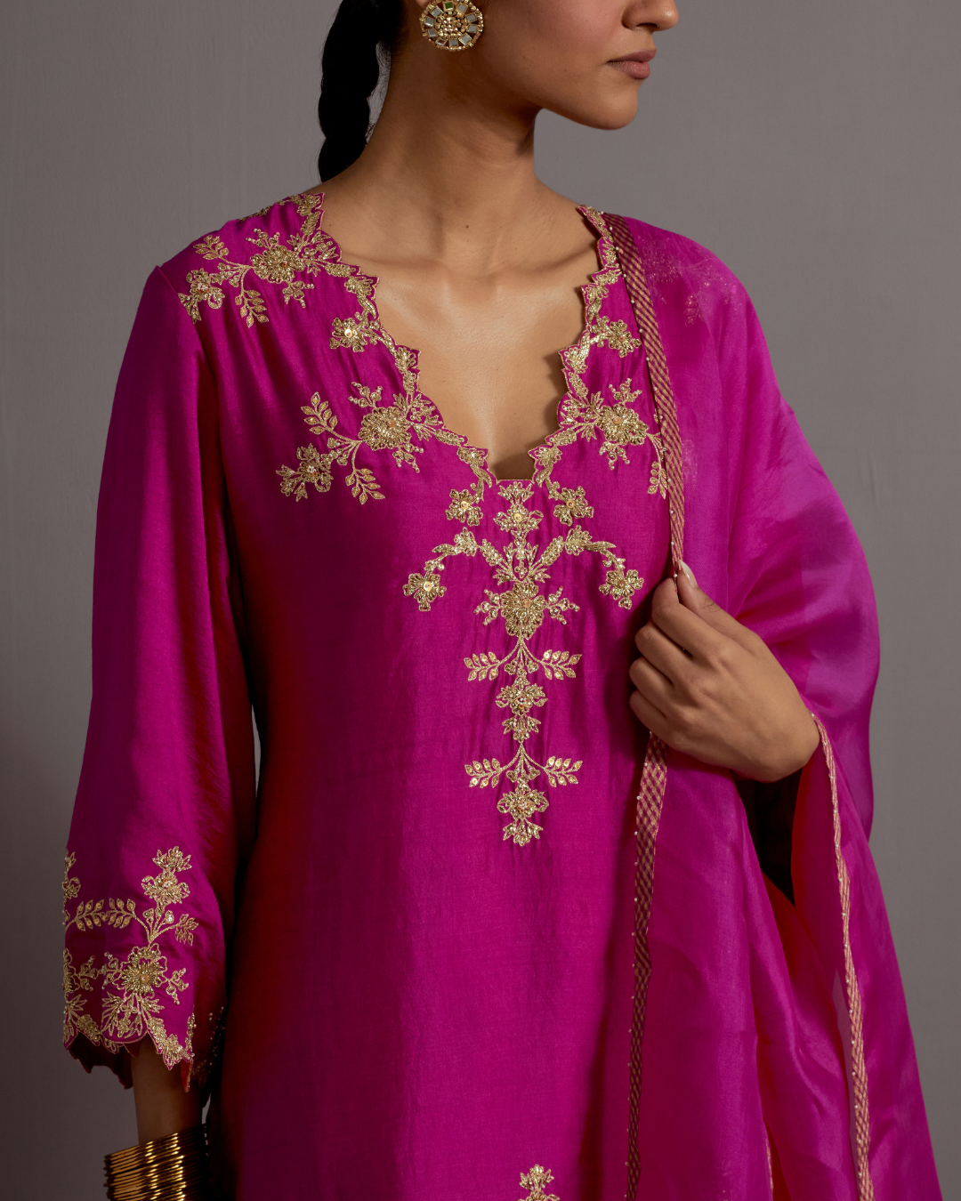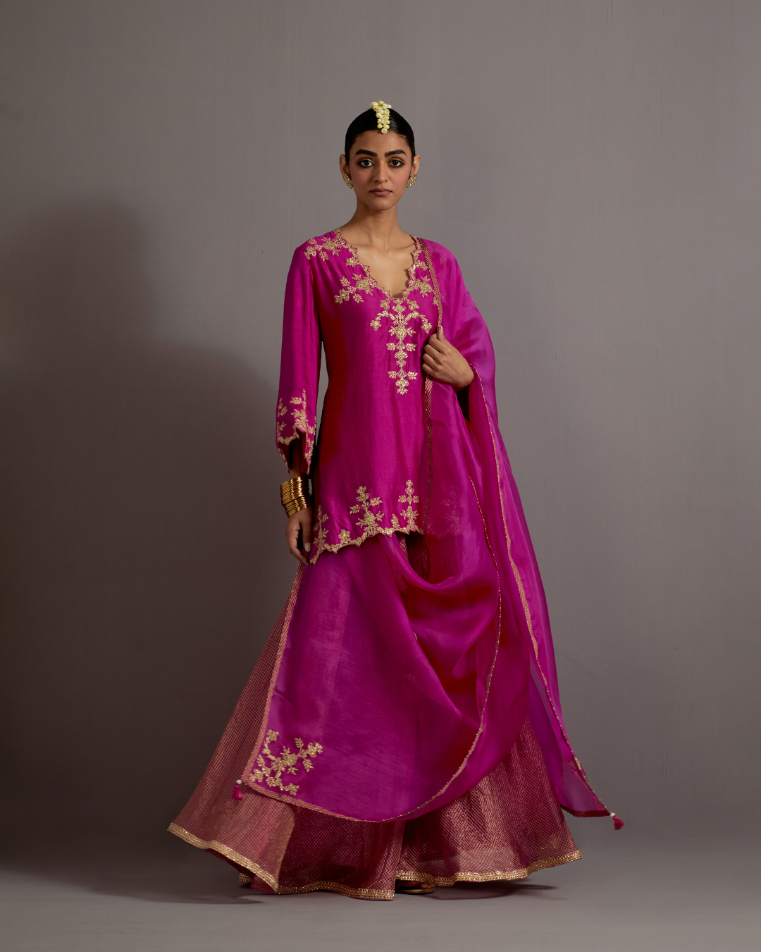 Description: A wedding wardrobe staple, featuring a bright shade of Fuchsia kurta with hand embroidered yoke & sleeves detail. The kurta is paired with a crushed tissue sharara pants and organza dupatta with distinct embroidered buttas.
