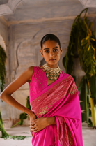 Description: Featured here is our hand embroidered saree in fuchsia with tissue border all around. The saree is paired with a V neck blouse.