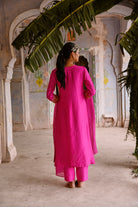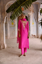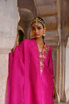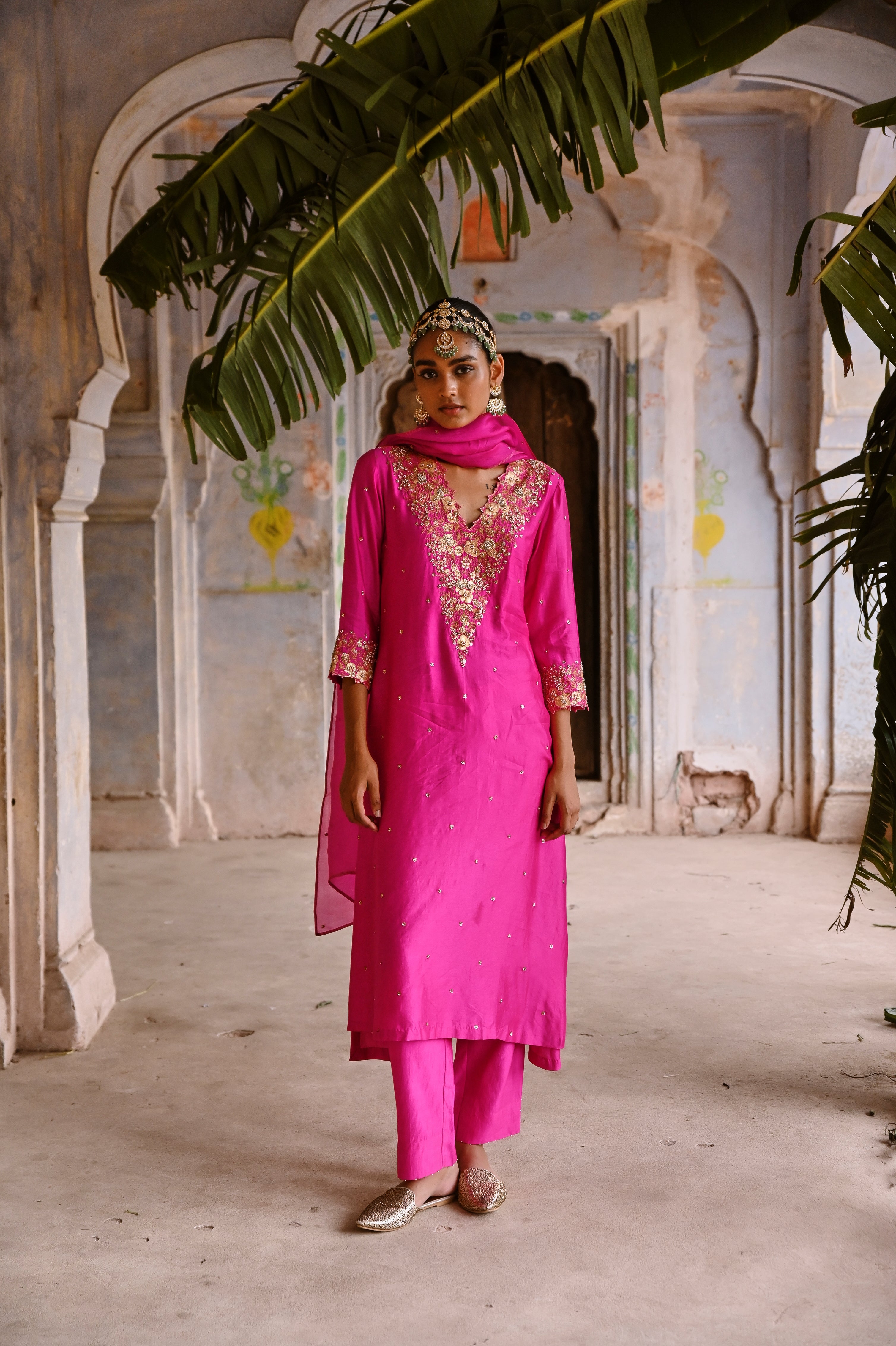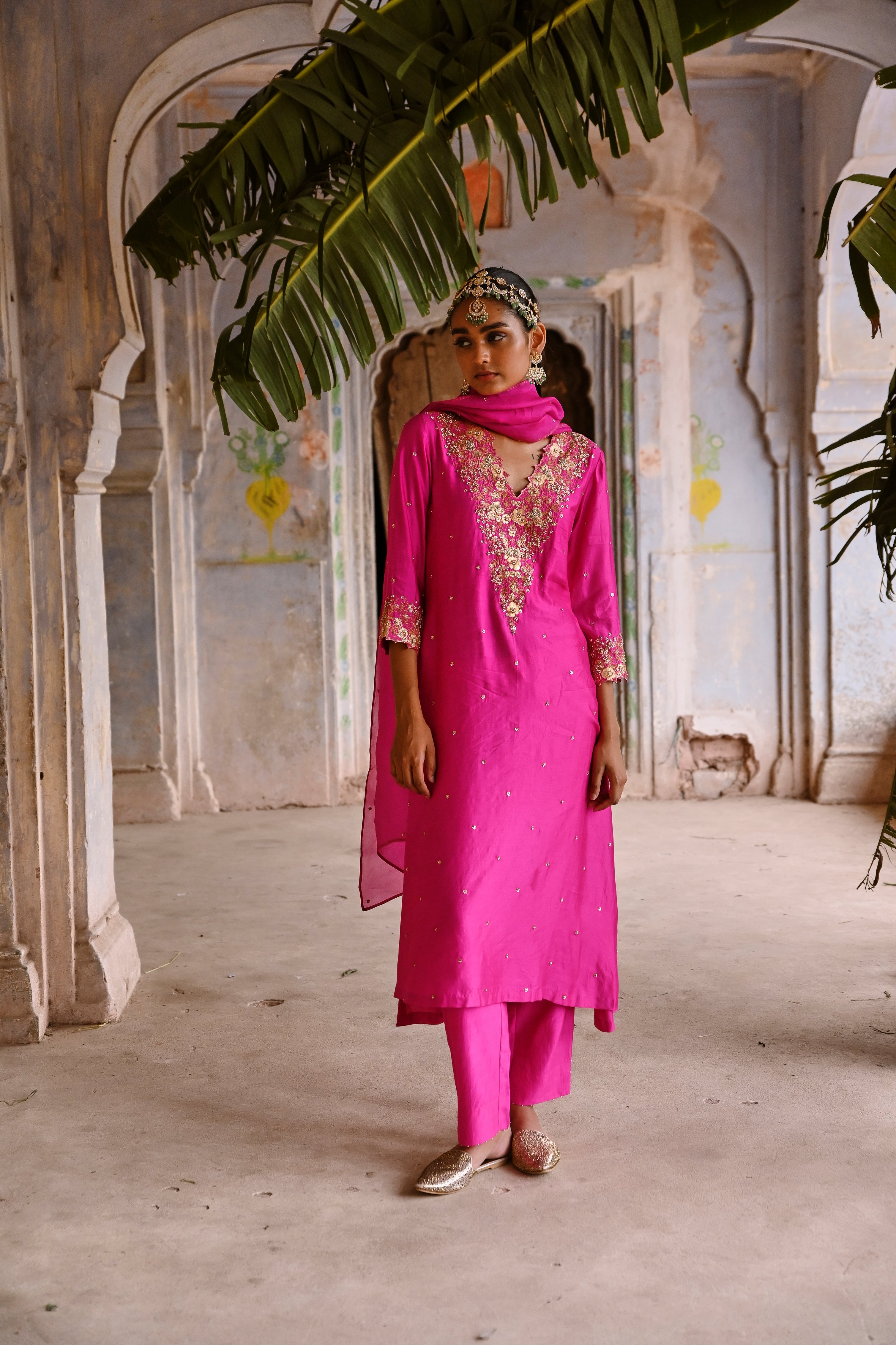 Description: Featured here is our V neck kurta in fuchsia with intricate hand embroidered yoke. The kurta is paired with a straight fit trousers and organza dupatta in fuchsia.
