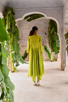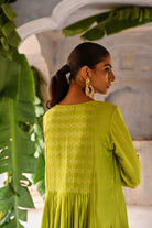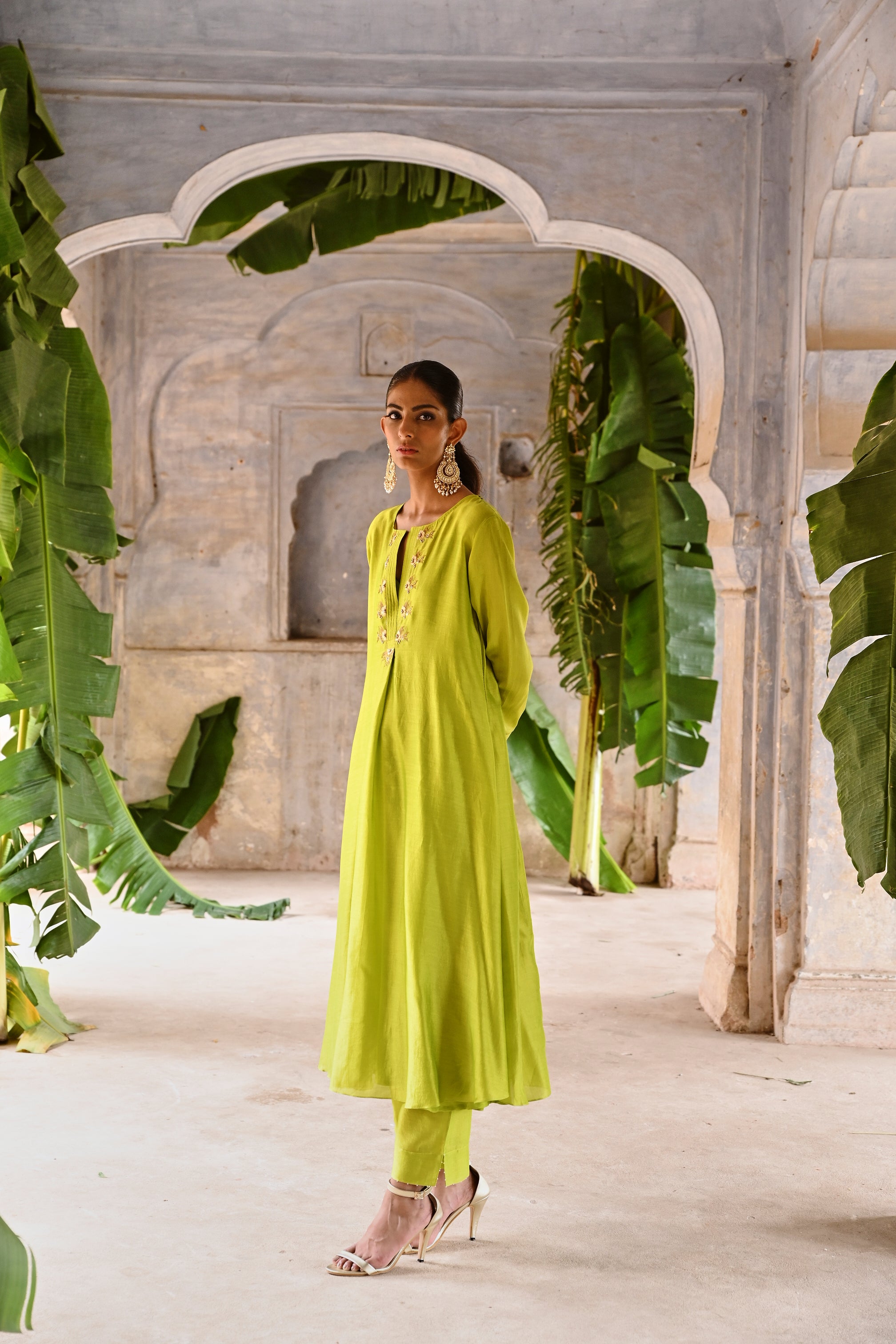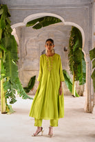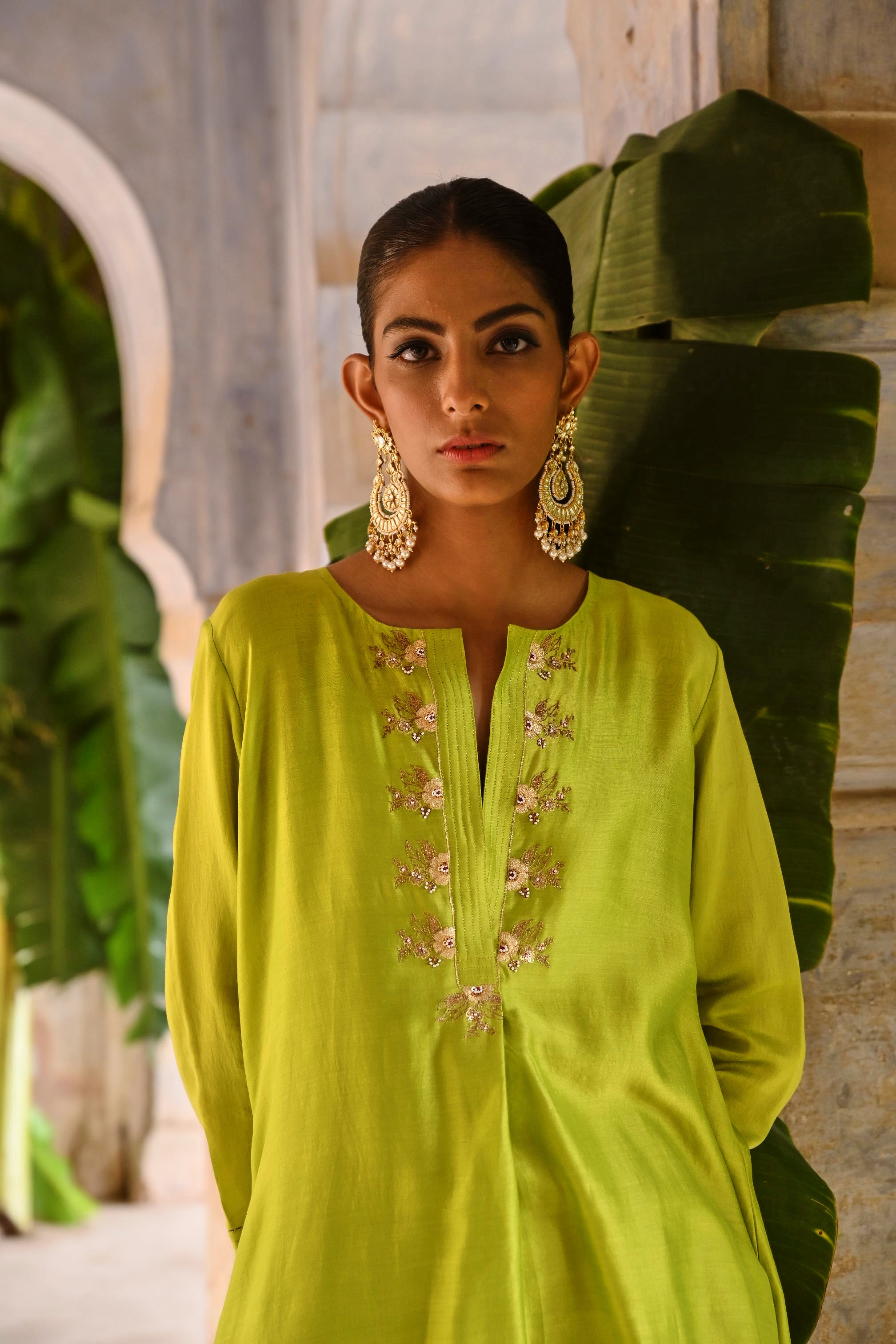 Description: Featured here is our lime green kurta set with embroidery on the neckline and is paired with a straight fit pants. The kurta also features pleated yoke on the back with embroidered details.