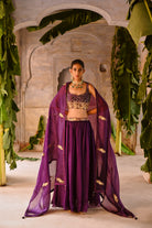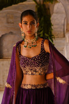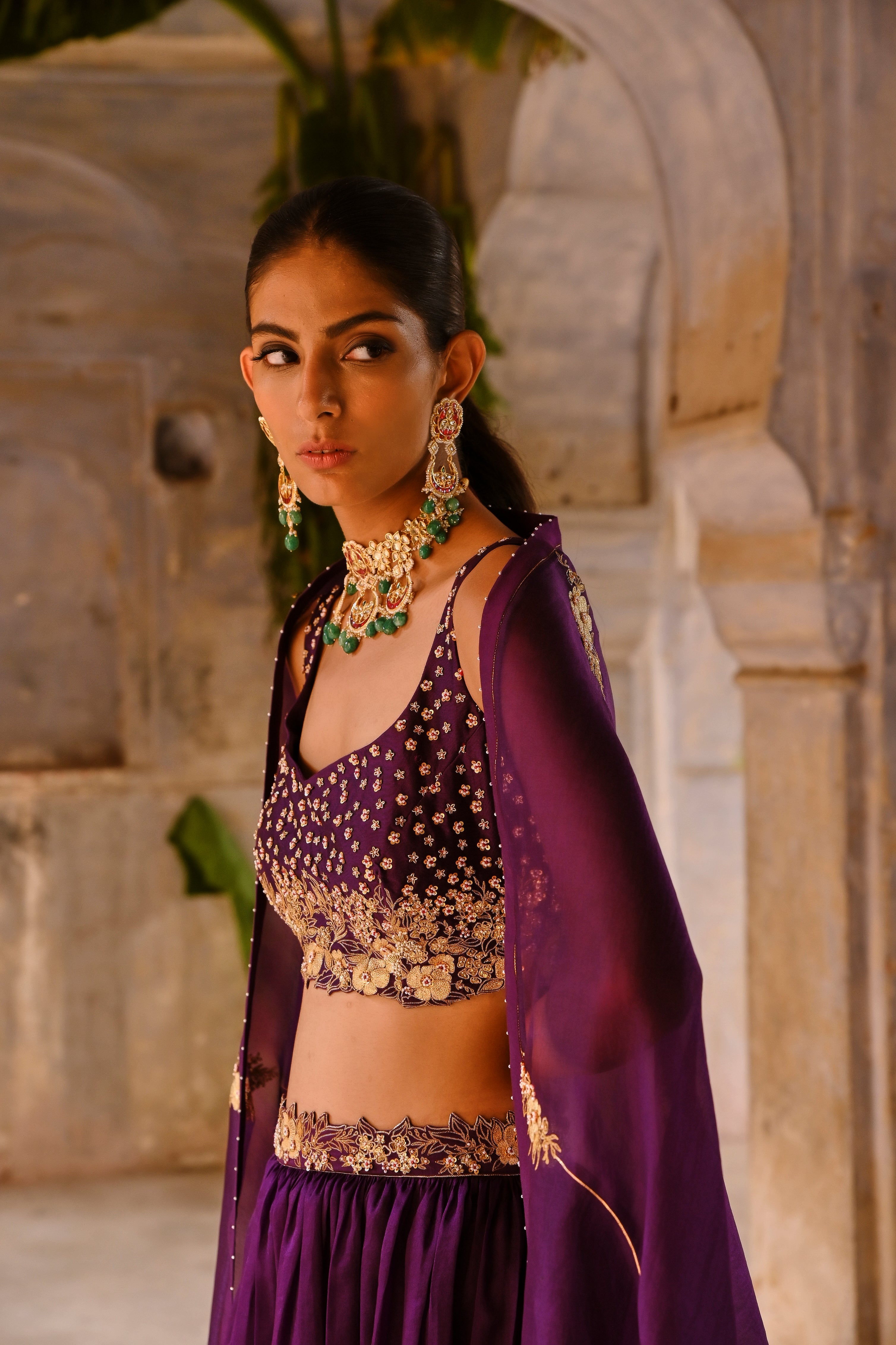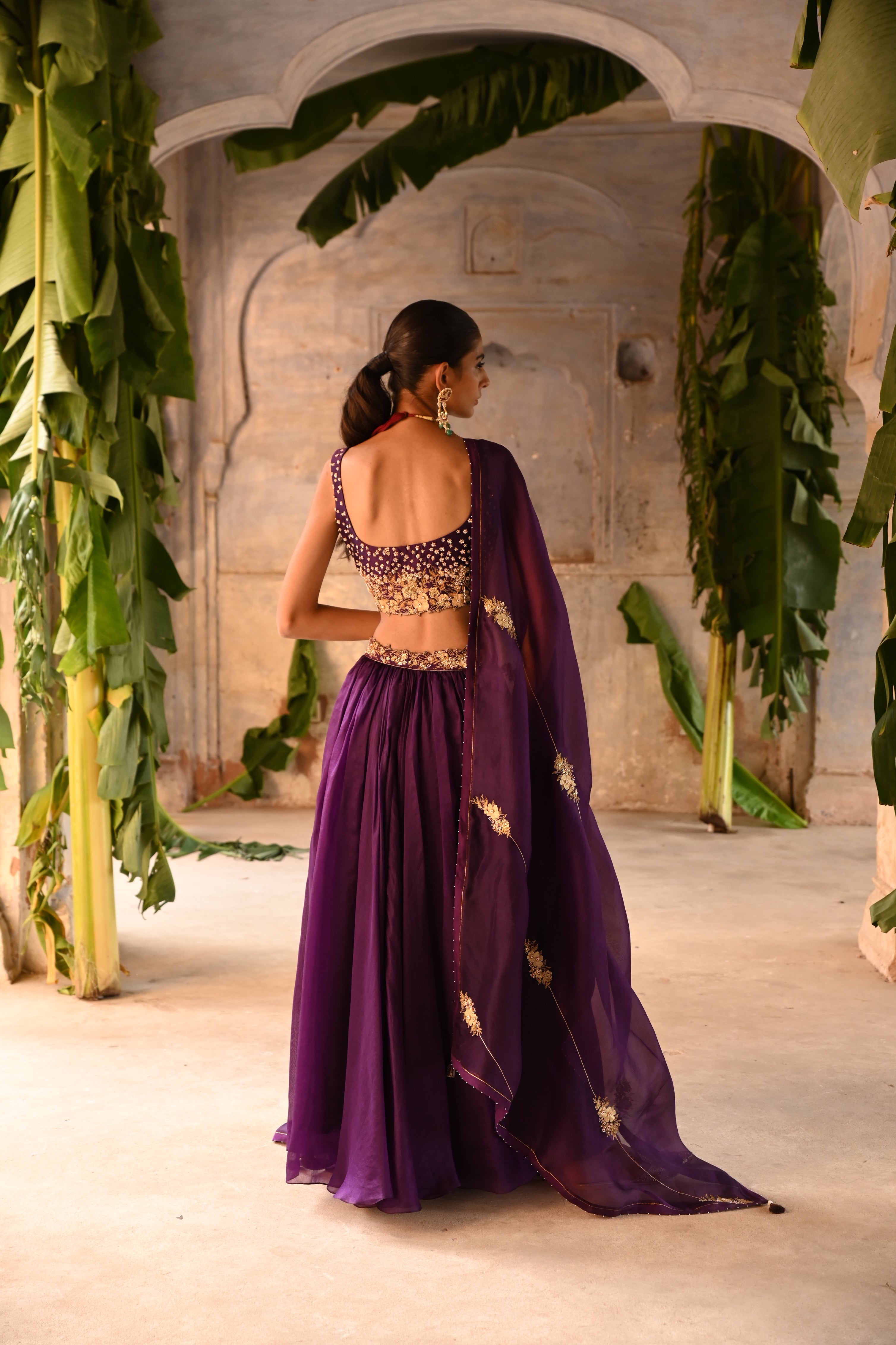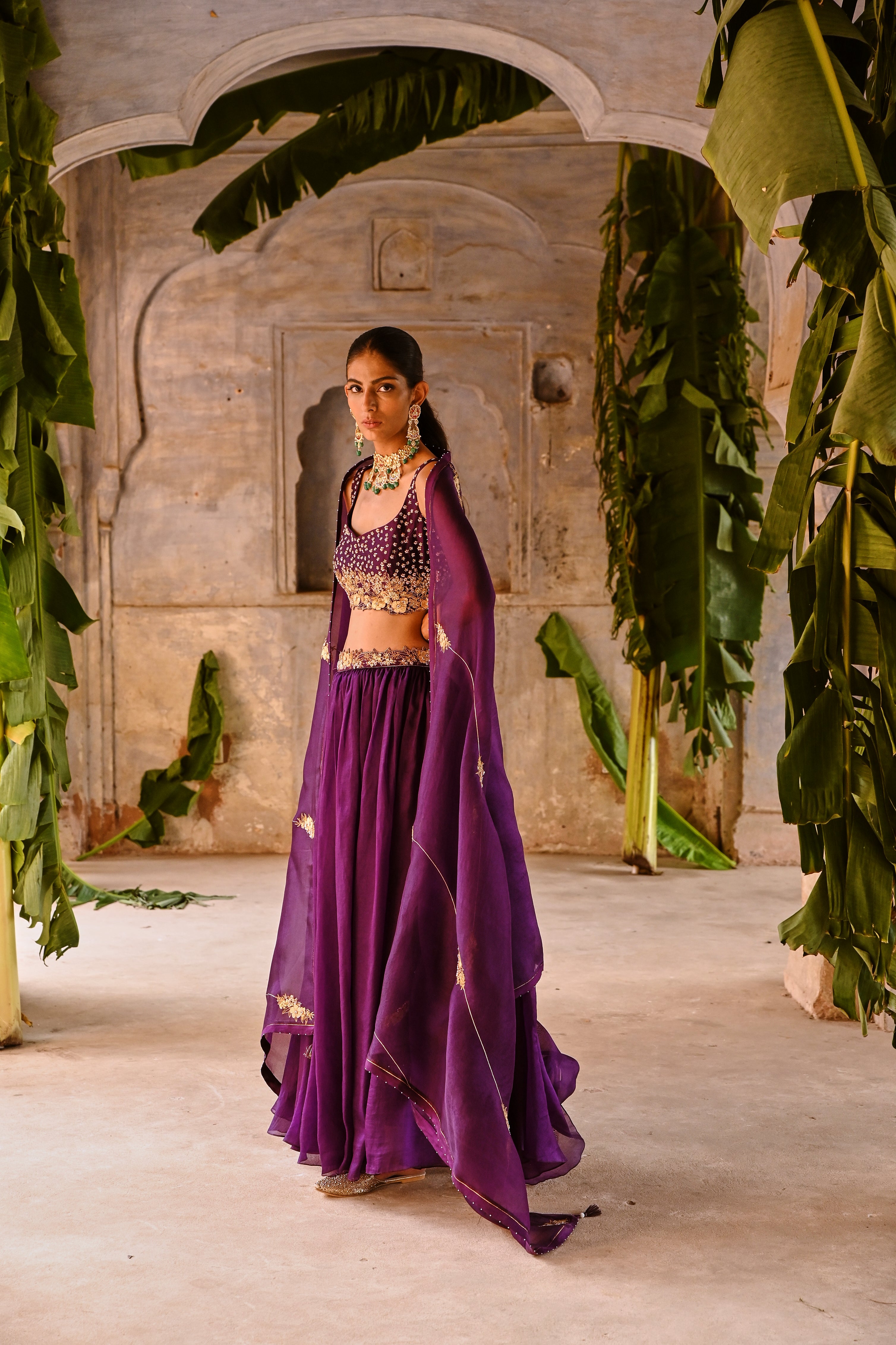 Description: Featured here is our hand embroidered purple blouse which is paired with a skirt and hand embroidered waist band. The skirt set is paired with organza dupatta featuring embroidered buttas at intervals.