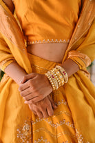 Description: Featured here is our Mustard lehenga with intricate embroidery all over the skirt. The lehenga is paired with a high neck sleeveless blouse and uneven hemline dupatta.