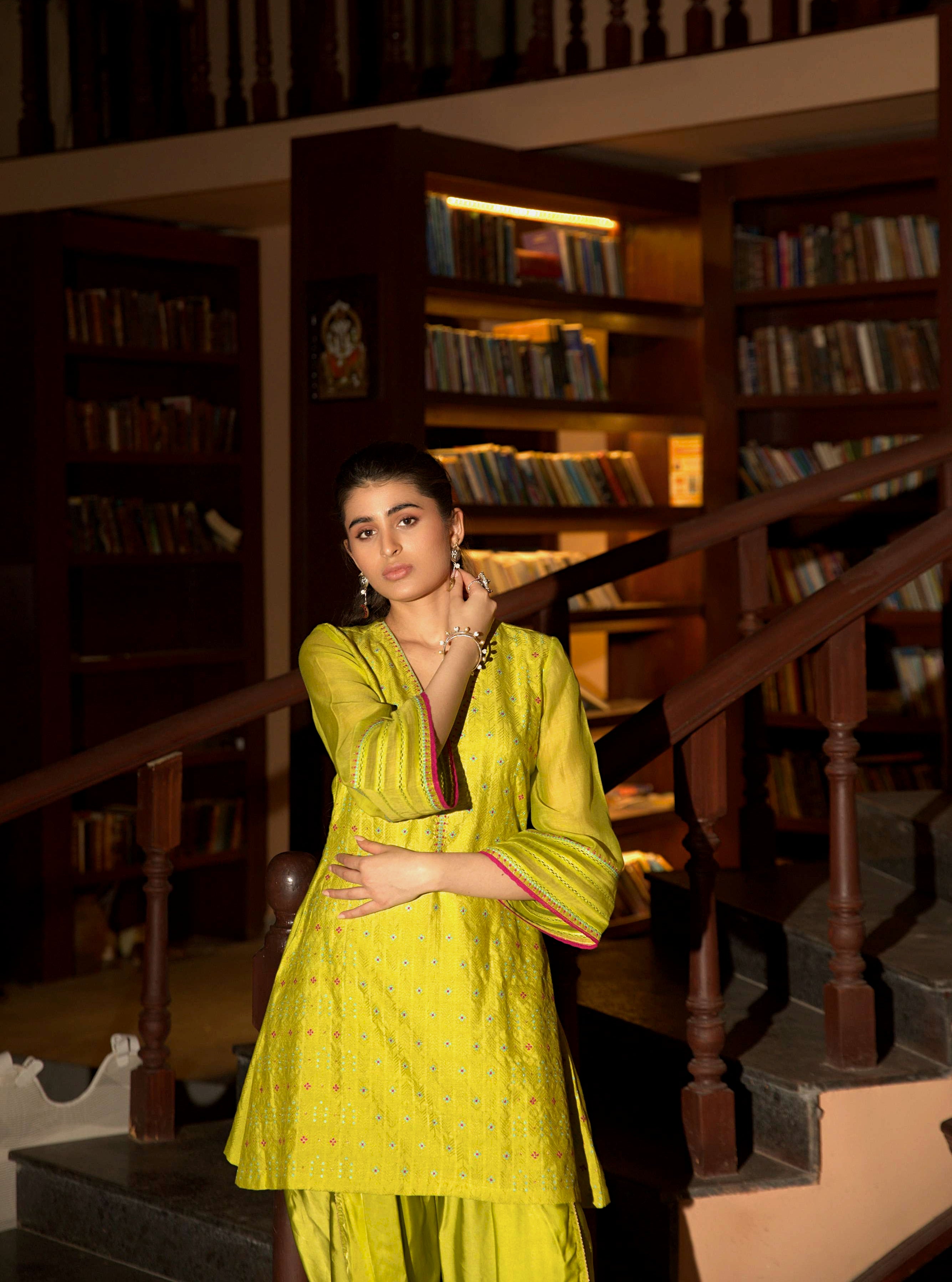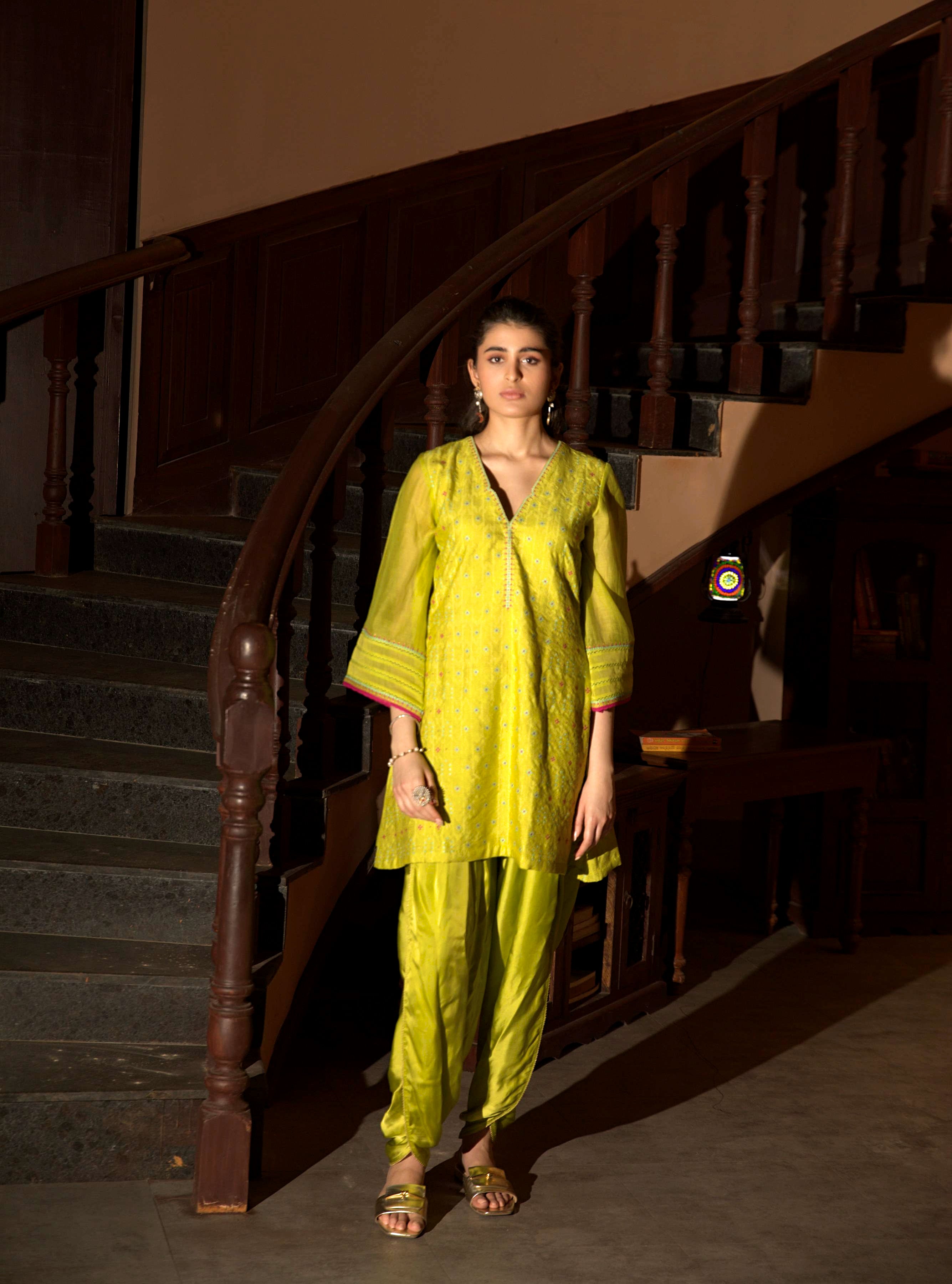 Description: Featured here is our lime green short kurta with hand woven and hand embroidered details on the front. The kurta also features flared sleeve with contrasting hemline details. The kurta is paired with a satin tulip pants.