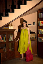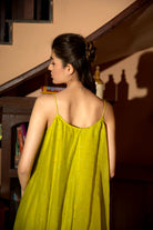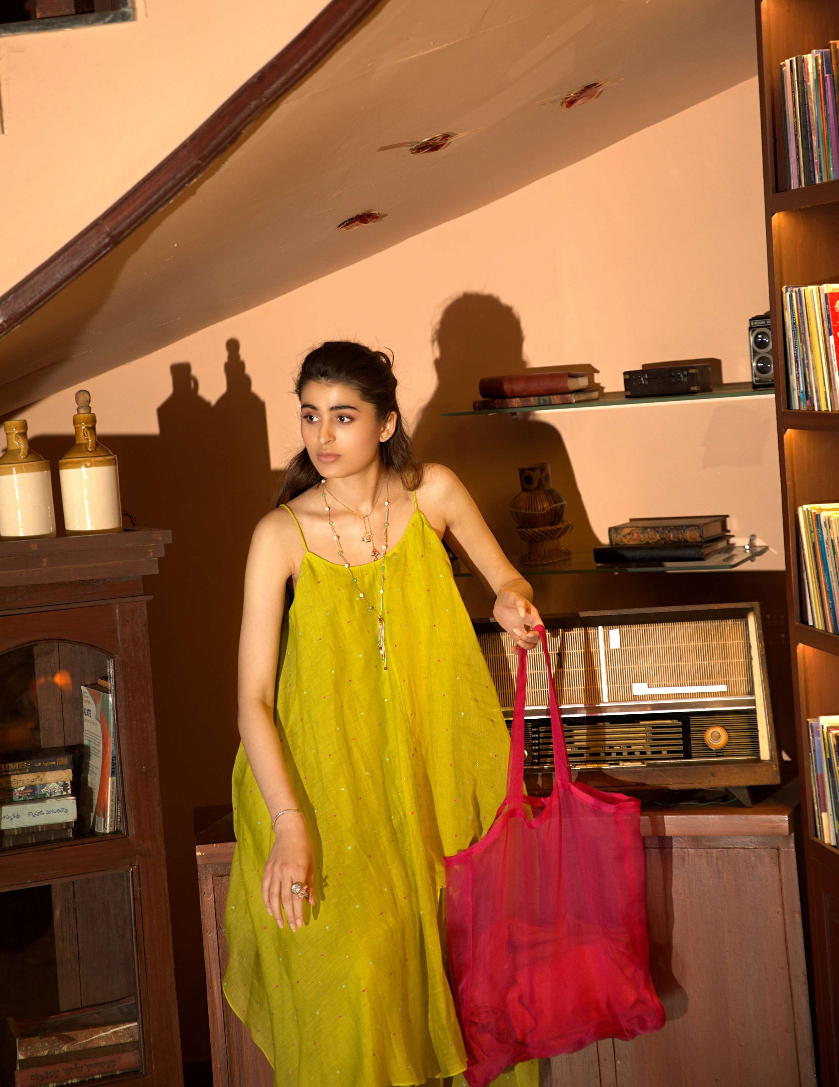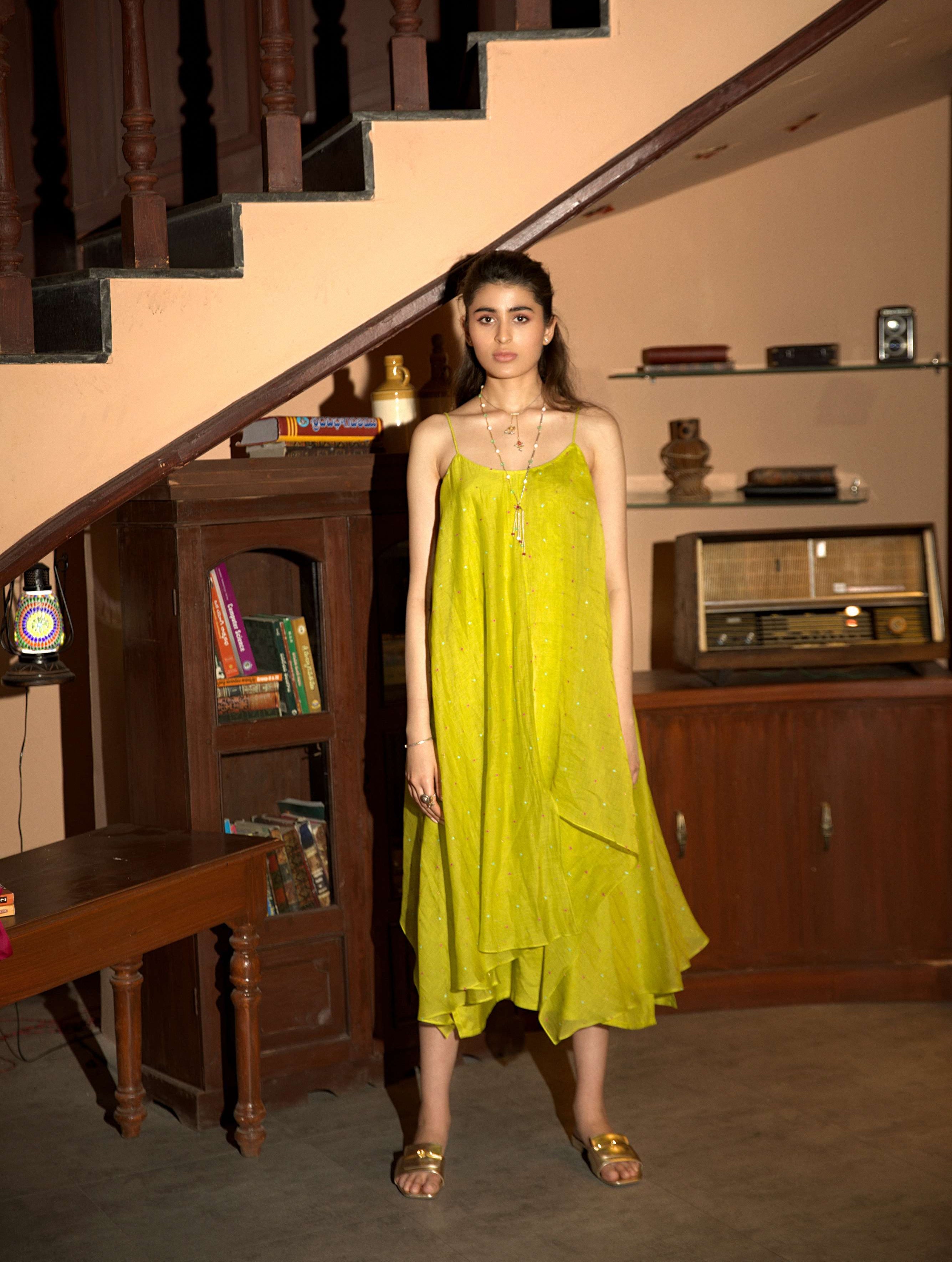 Description: Featured here is our lime green strapy dress with embroidered details on the front. The dress features un even hemlines and is layered with a slip.