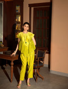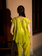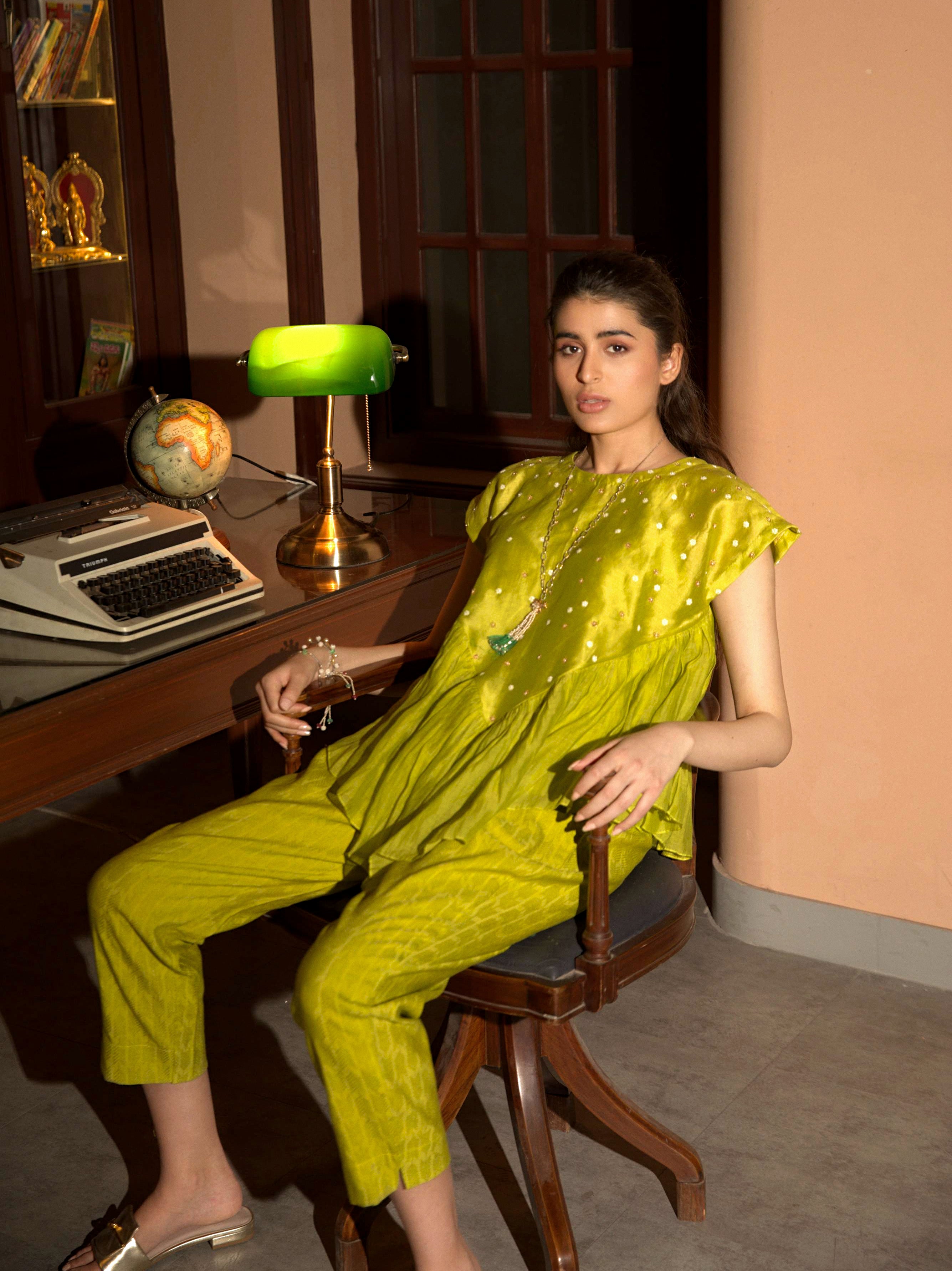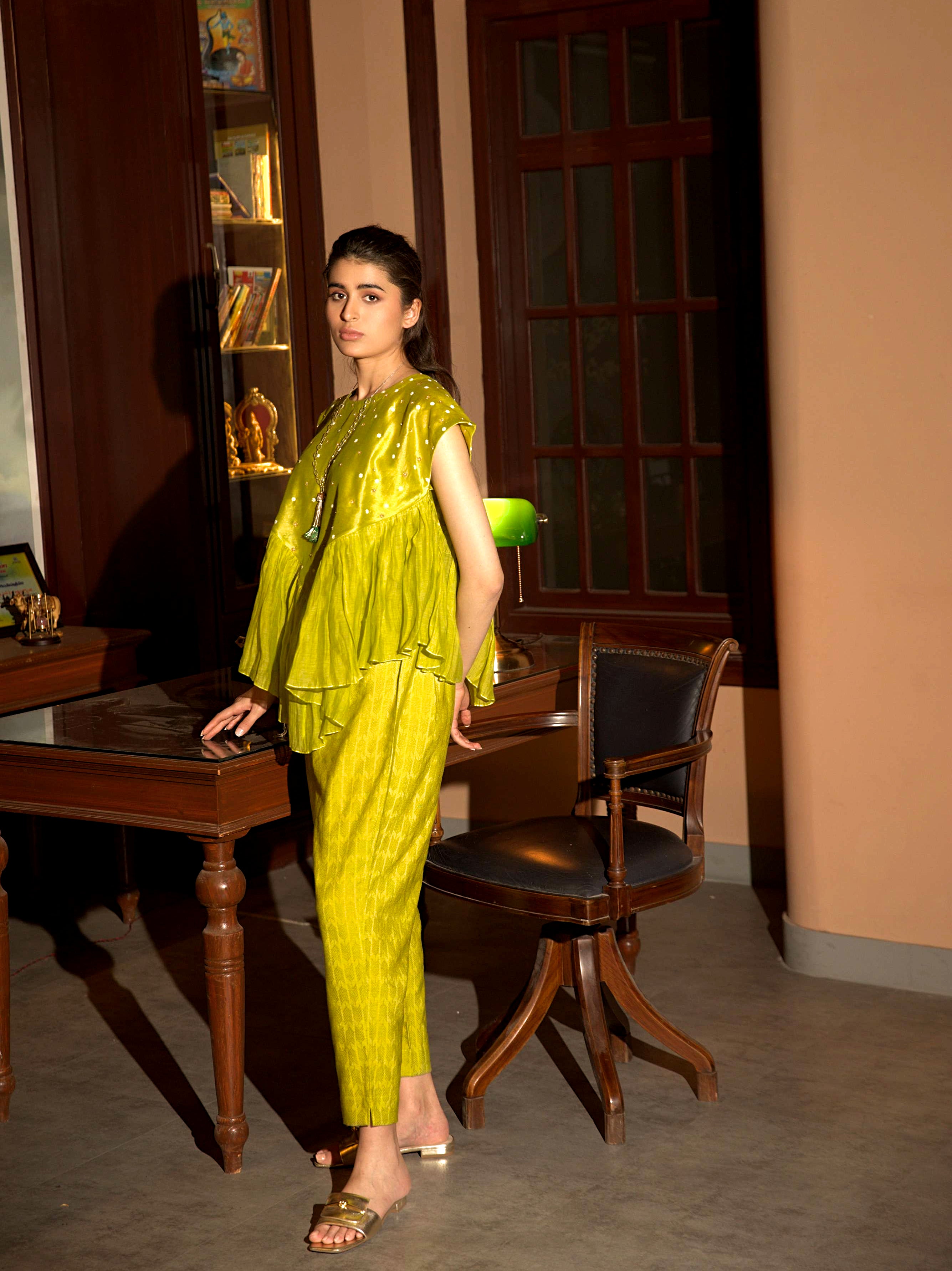 Description: Featured here is our lime green top with uneven hemline and embroidered details on the front. The top is paired with lime green hand woven straight fit trousers.