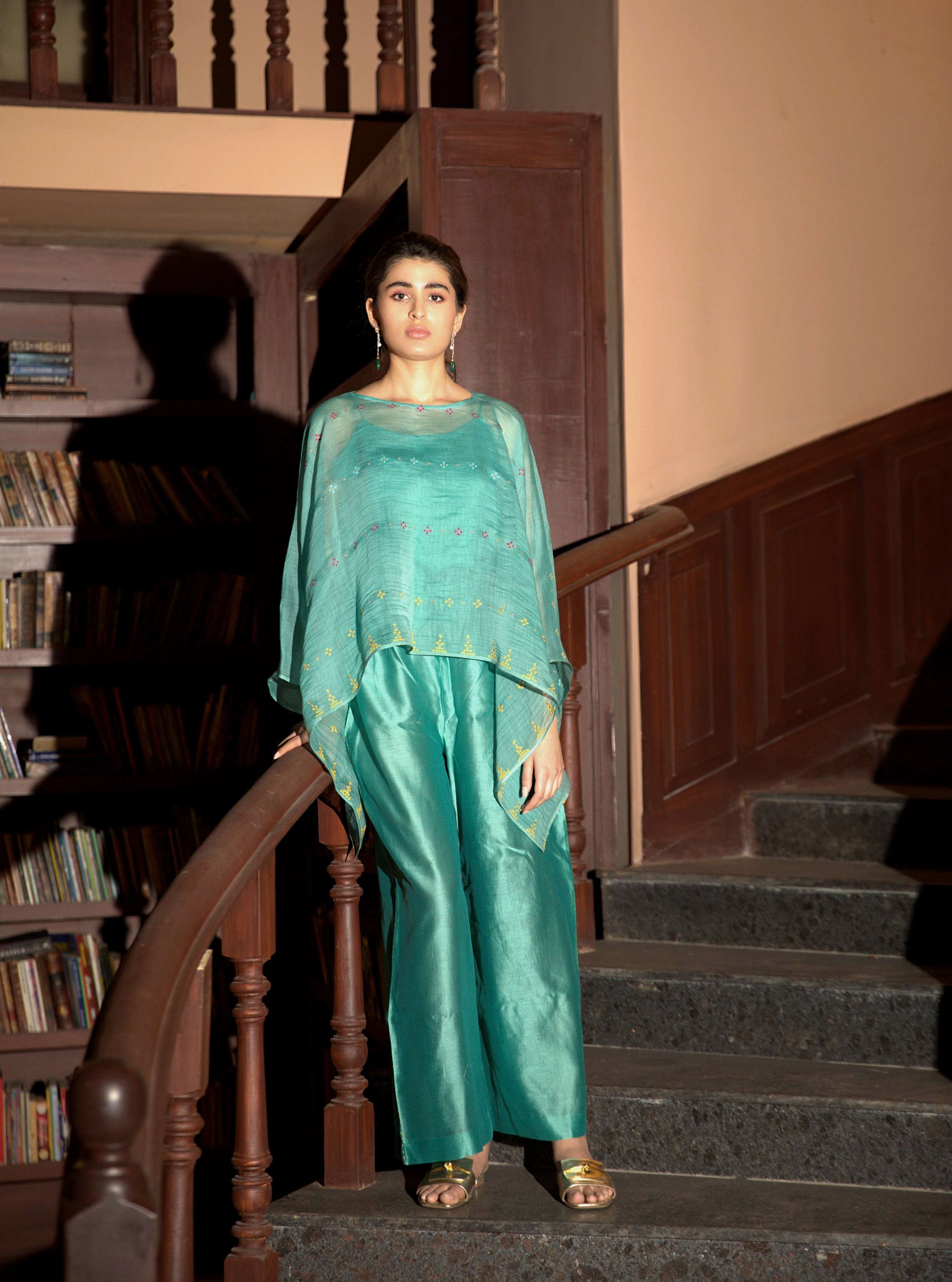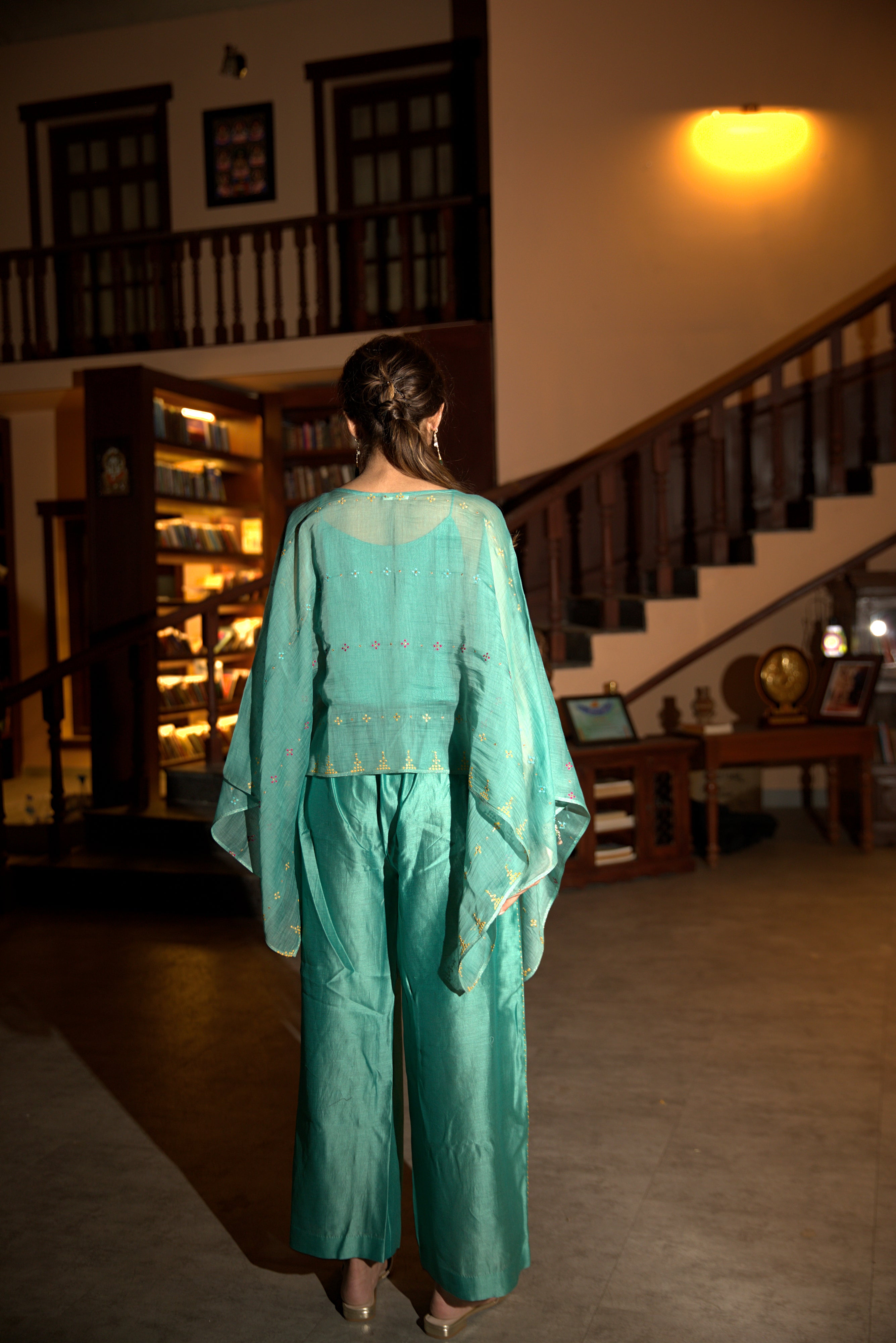 Description:Featured here is our powder blue cape top with hand embroidered details all over. The top is paired with a straight fit trousers.