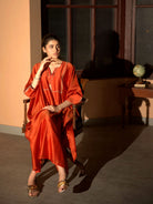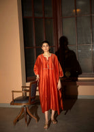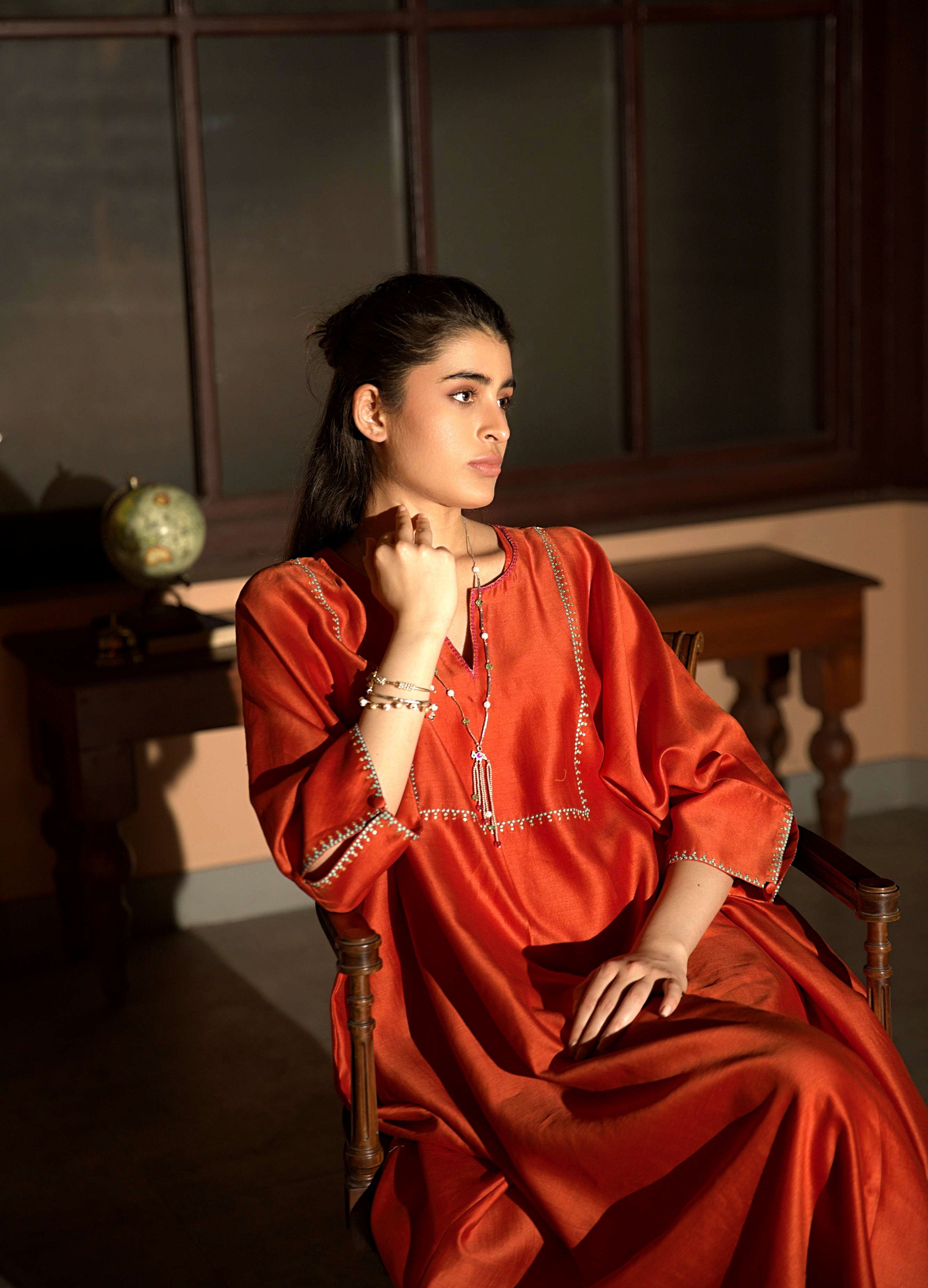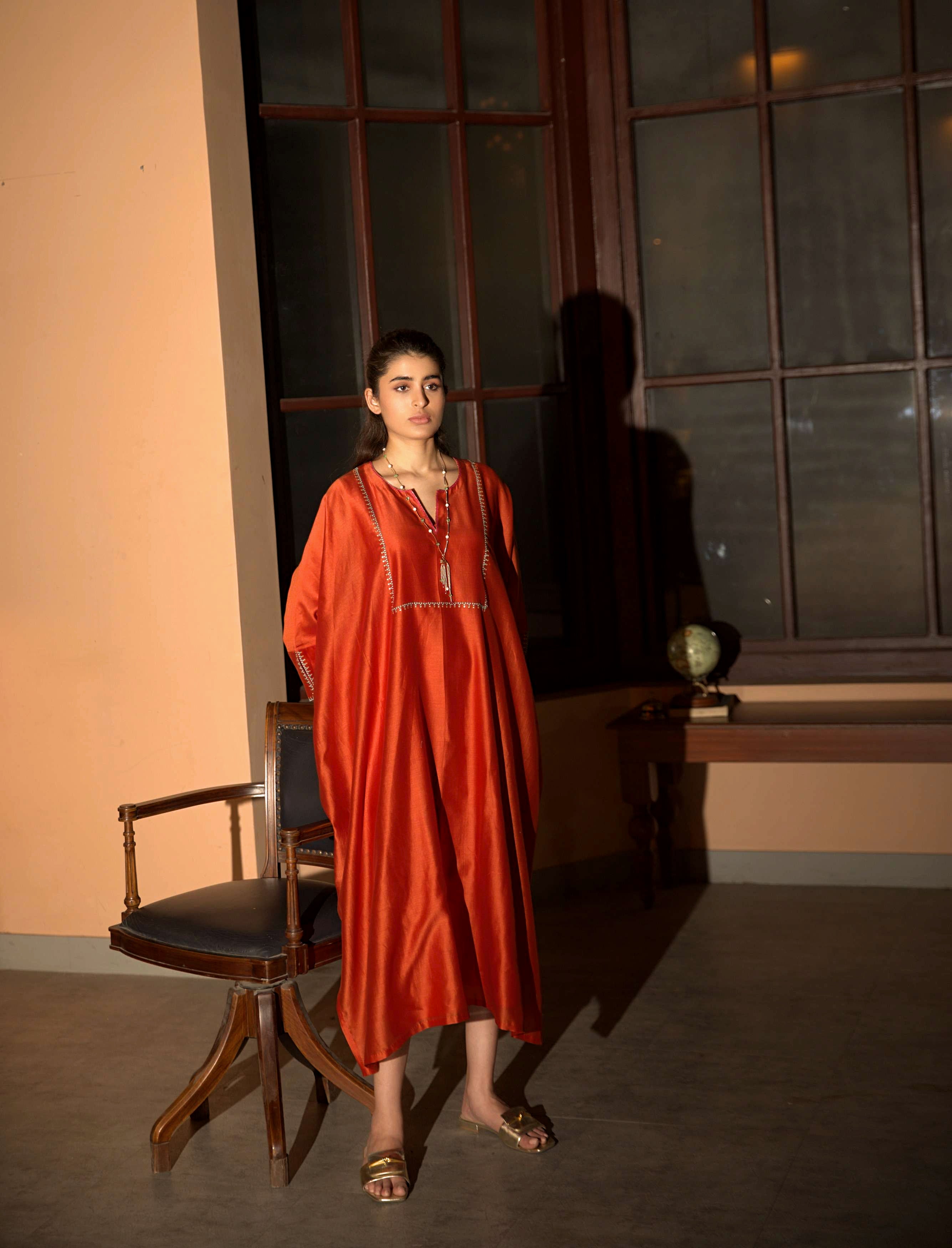 Description: Featured here is our rust orange kaftan with hand embroidered yoke and sleeve cuff.