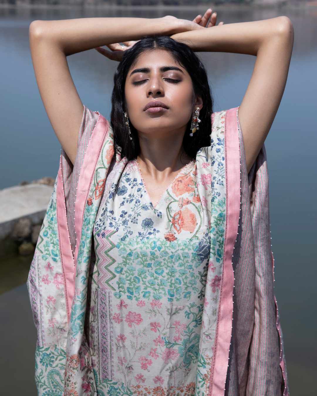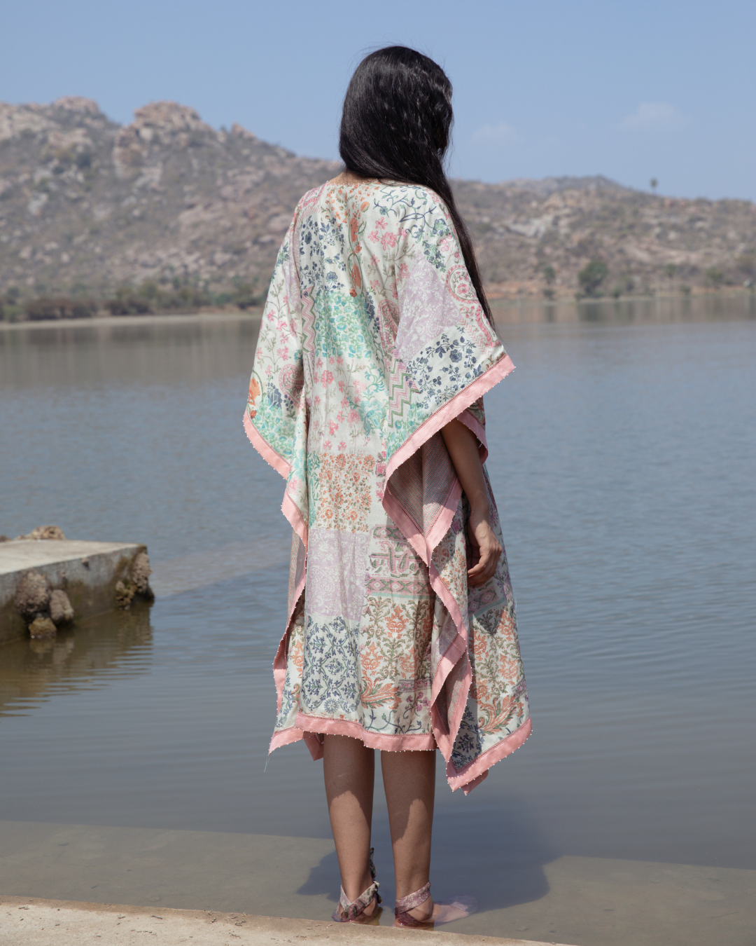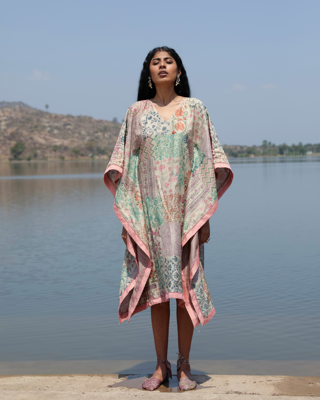 Featured here is our multi block printed Kaftan with pearl embellishment on the hem and neckline.