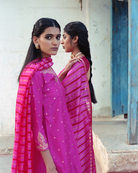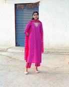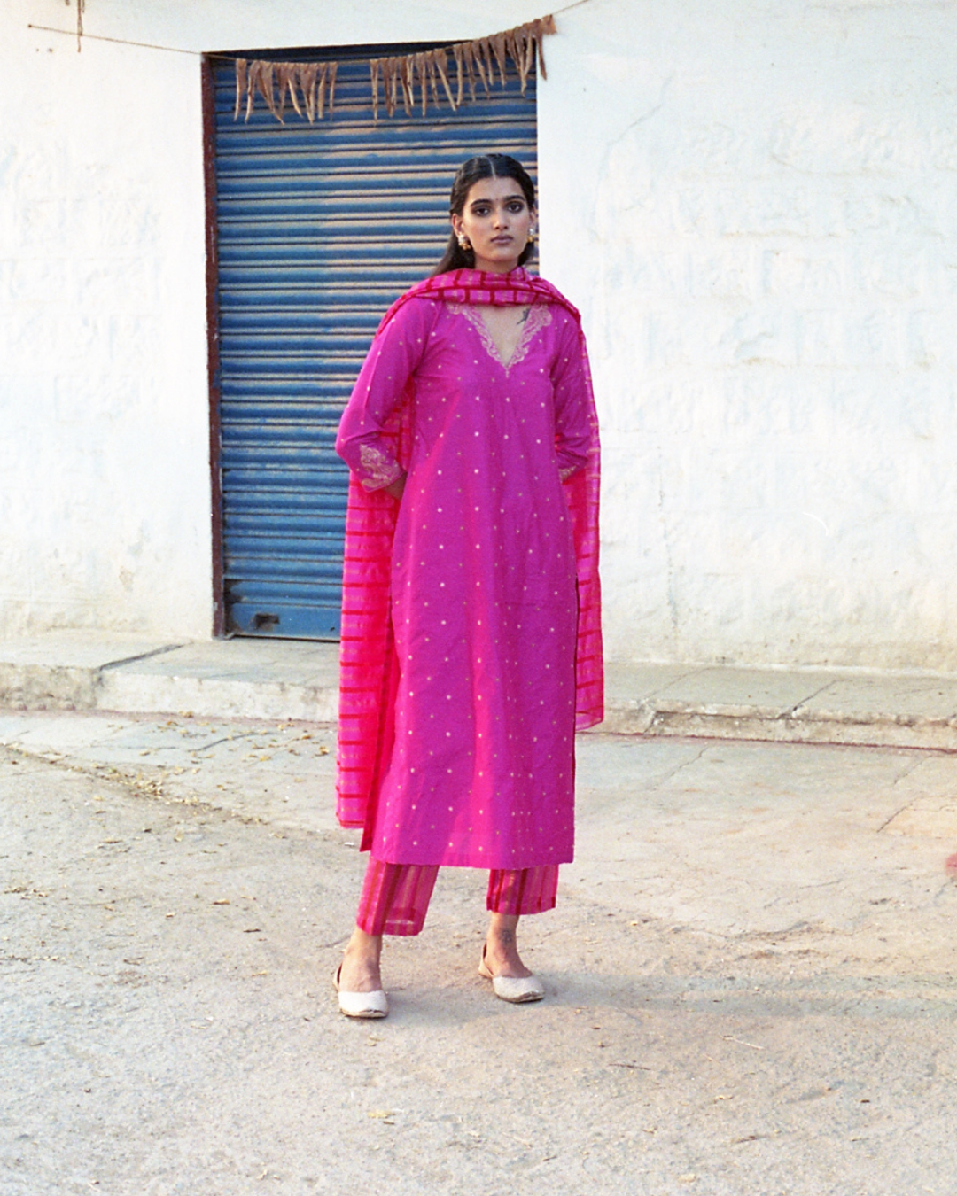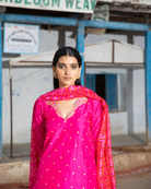 Our absolute favourite fuchsia straight fit kurta with embellished V neckline and buttis all over, styled with striped trousers and dupatta.