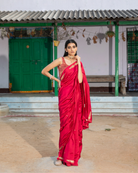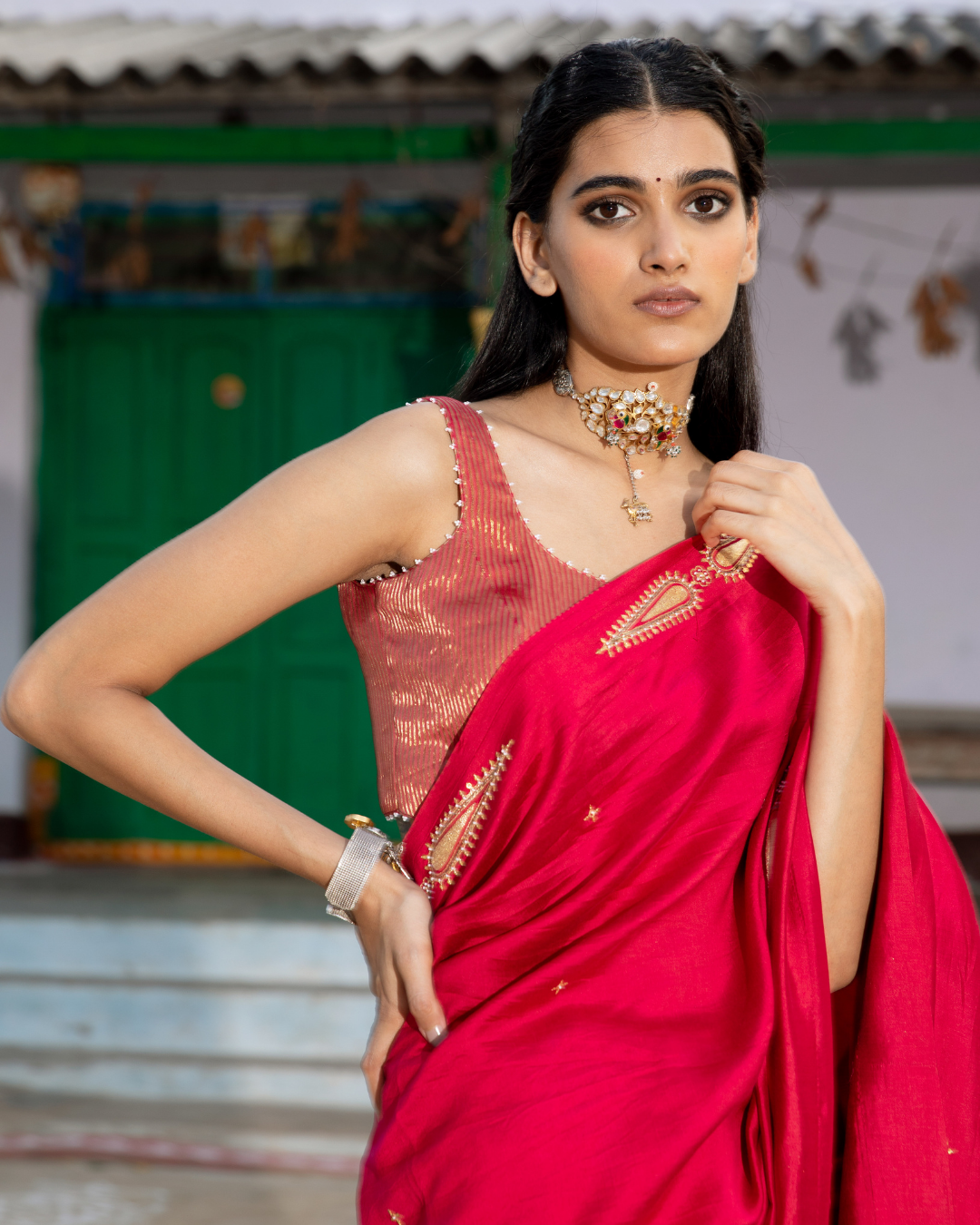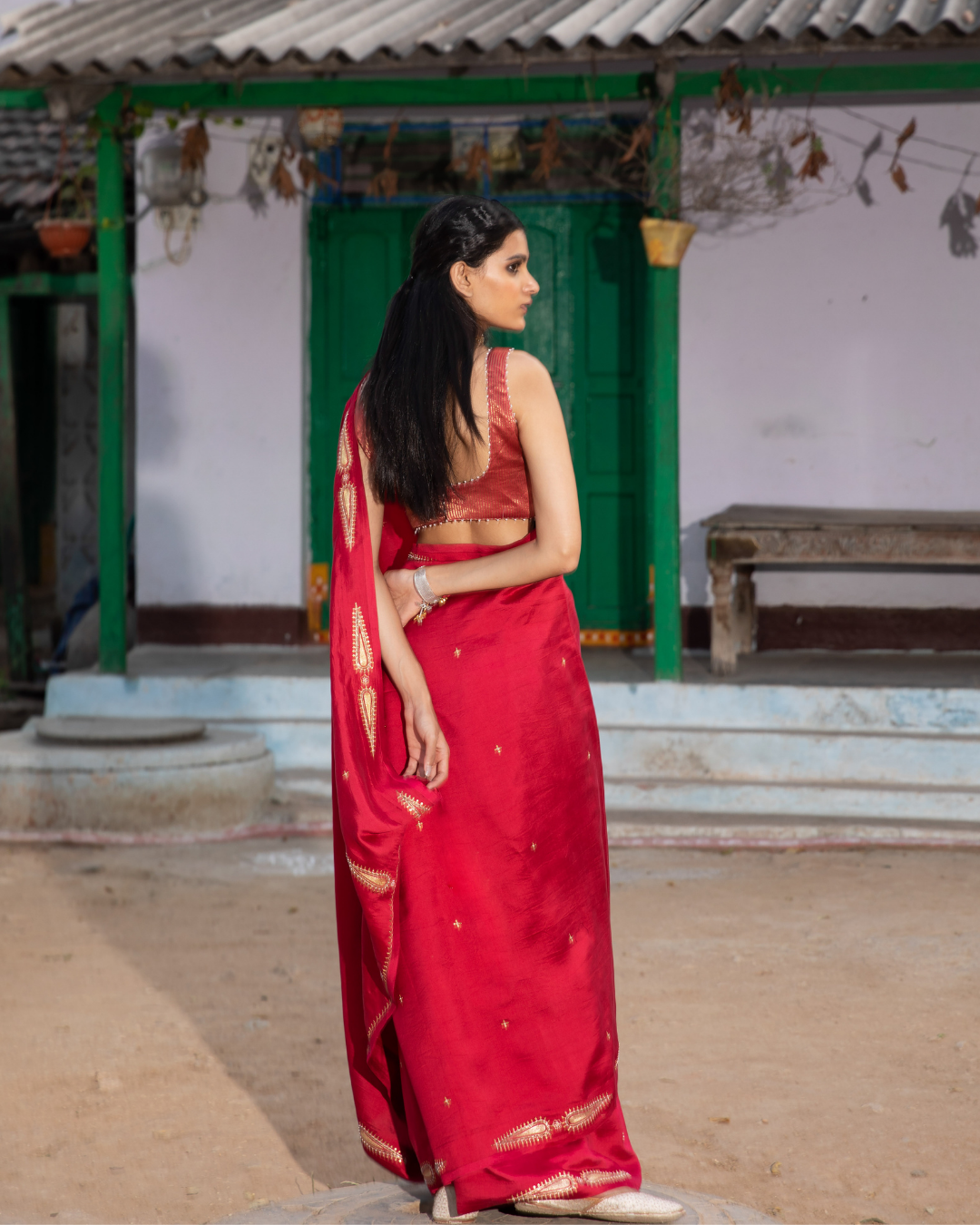 Our classic red sari which is embellished with fine gota with moti paan motifs on the border and palla with buttis all over. Sari is featured with a versatile red striped tissue blouse with motis on the hem.
