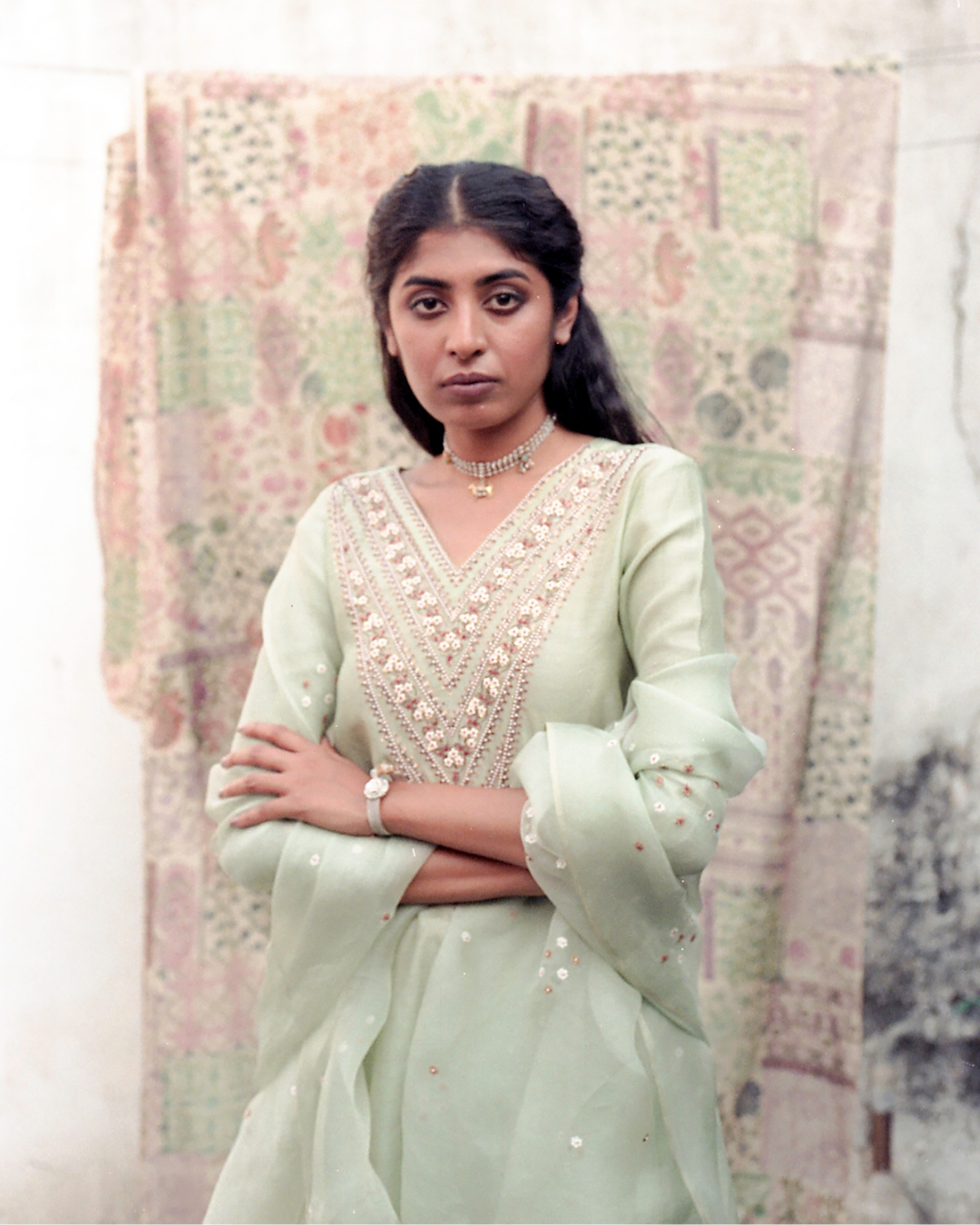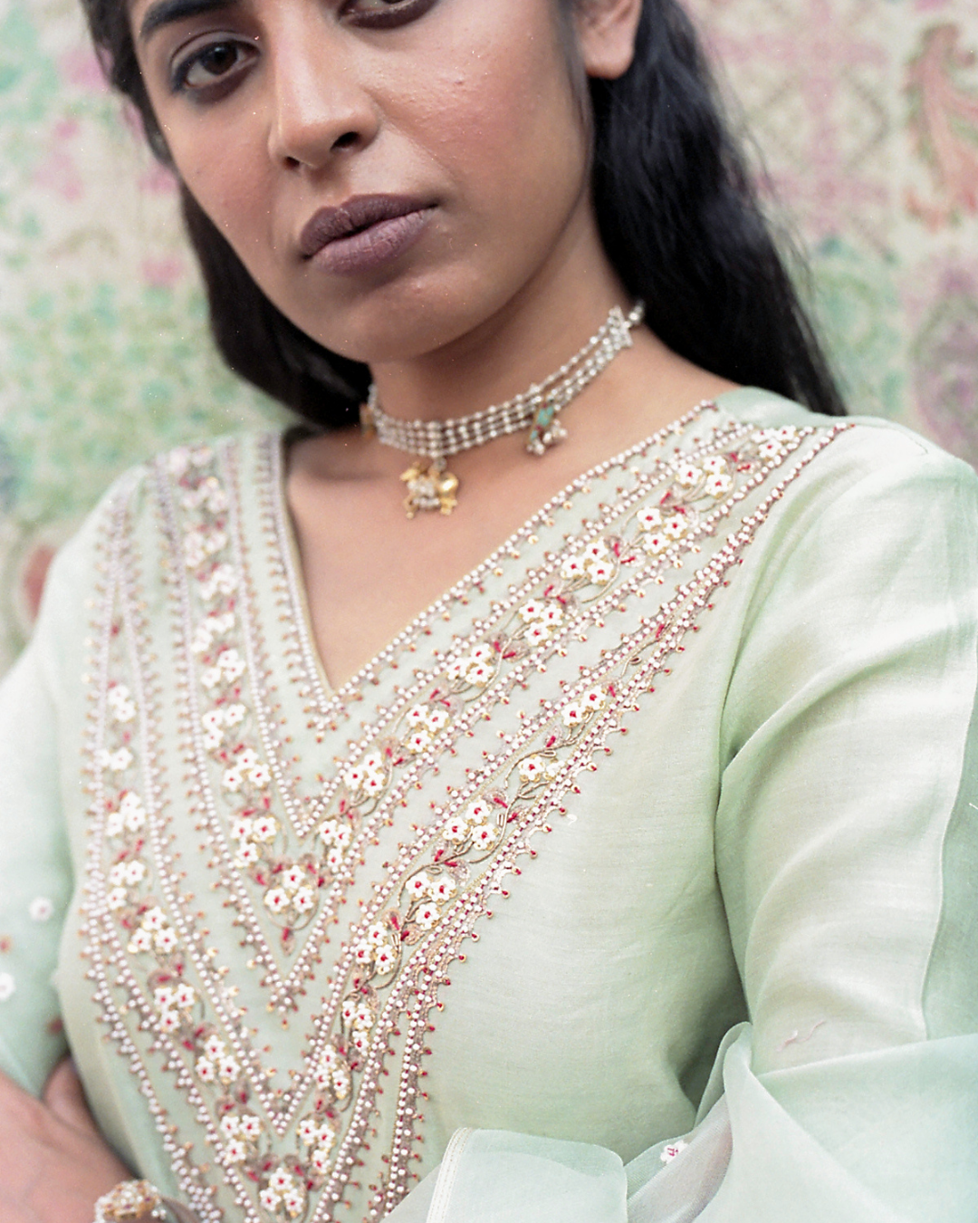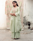 Featured here is our mint green kurta set with fine embellished details on the neck. The kurta is paired with a flowing sharara with embroidered edges.