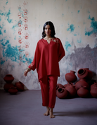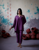 Description: Fuchsia Co-ord Set in luxurious silk showcases an elegant anti-fit silhouette, enhanced by intricate aari embroidery that adds a refined artisanal touch. The ensemble includes a beautifully crafted top paired with straight-fit trousers, offering a balanced and sophisticated look.