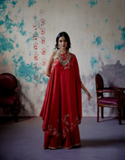 Description: Elegant fuchsia one-shoulder top crafted from silk showcases intricate hand embroidery along the neckline and hem, adding a refined artisanal touch. It pairs beautifully with a flowy skirt featuring kalis, creating a graceful silhouette perfect for special mehendi and haldi occasions. The combination highlights expert craftsmanship and sophisticated design, ensuring a standout ensemble.