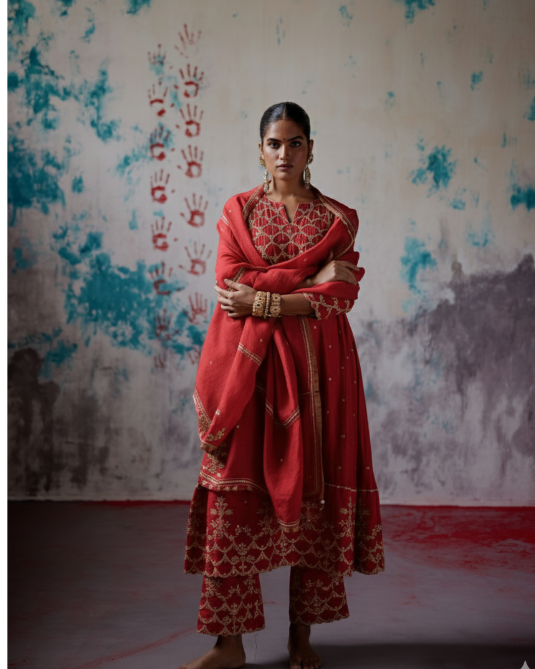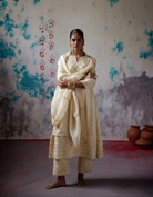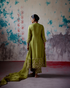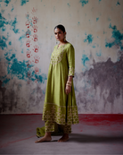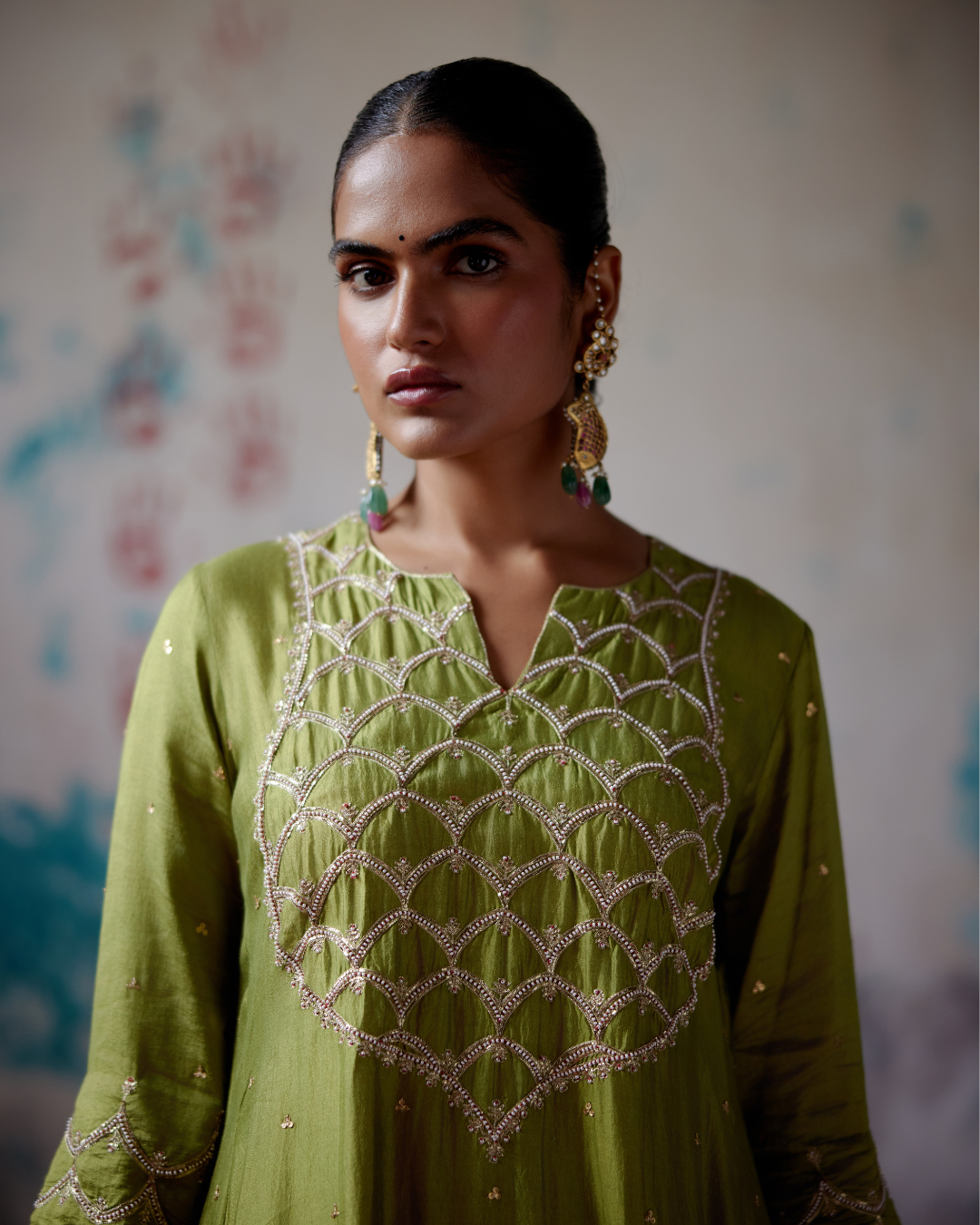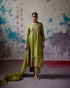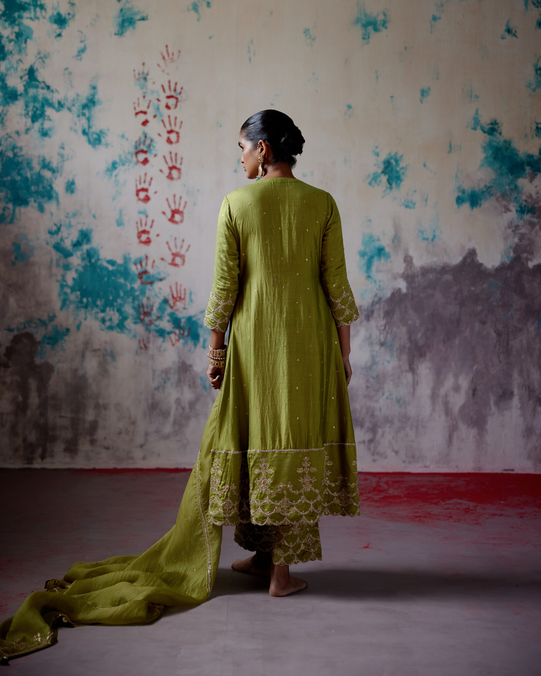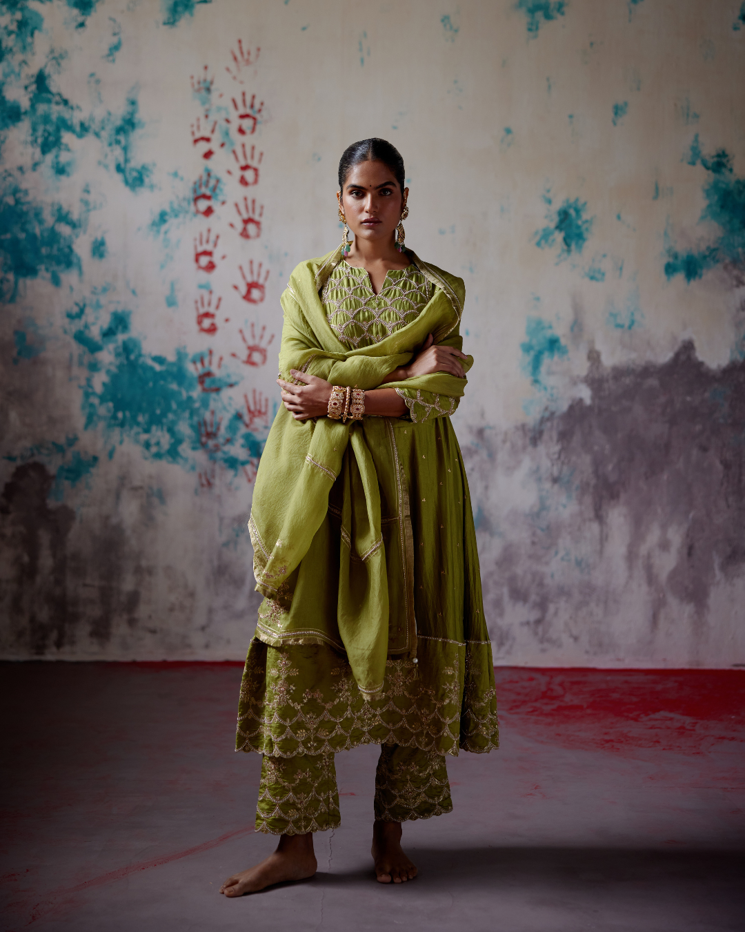 Description: Silk Olive A-Line kurta showcases detailed embroidery on the yoke, sleeves, and hem, crafted with delicate aari and moti techniques. It is complemented by straight pants adorned with scalloped hand embroidery and an organza dupatta, creating a refined and cohesive ensemble.