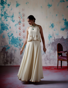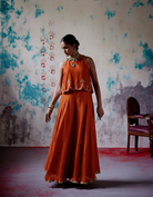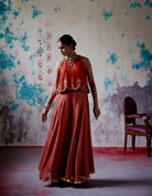 Complementing the top are crinkled tissue flared trousers that provide a graceful silhouette and effortless movement. This coordinated ensemble is perfect for those seeking a blend of luxury fabric and contemporary design, ideal for both casual outings and special occasions.