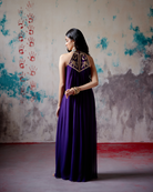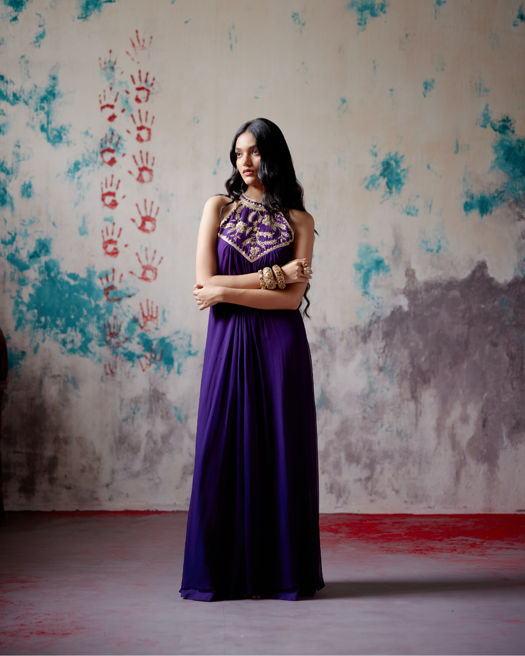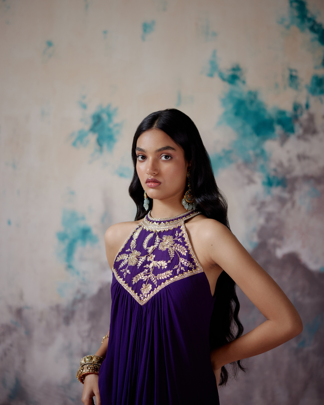 Description: Elegant purple chiffon dress showcases a sophisticated halter neck design, enhanced by intricate embroidery on both the front and back yoke. The lightweight fabric drapes gracefully, offering comfort and a flattering silhouette.